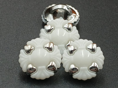 These are elegant, flower-shaped buttons featuring a striking white enamel finish with silver-tone metallic accents.