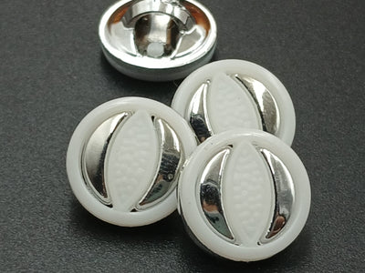 The buttons are circular with a central, oblong, shield-like feature. This feature is divided into three vertical sections: a shiny, mirror-finish chrome or silver metallic strip on the left and right, framing a central section of white or translucent plastic/resin with a textured, woven, or embossed pattern. This contrasting design gives the buttons a modern, stylish, and high-end look.