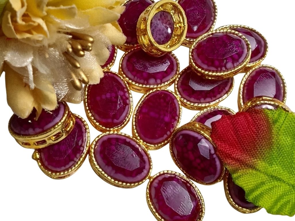 Oval-shaped resin stones with metal catchers offer a smooth, glossy finish paired with a secure metallic frame. They’re lightweight yet premium-looking, making them ideal for blouses, gowns, accessories, and DIY jewellery projects. The metal catcher adds durability and easy application while the resin stone brings a clean, polished shine to any design.