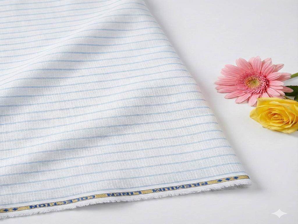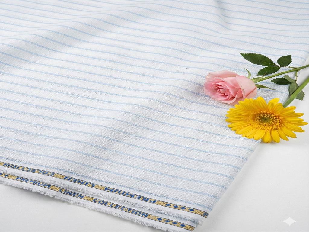 Experience ultimate comfort and style with our Off White Cotton Linen. This versatile fabric is perfect for all your wardrobe needs. Its breathable material with Blue lines give a modern and sophisticated touch to any outfit. Upgrade your wardrobe today!