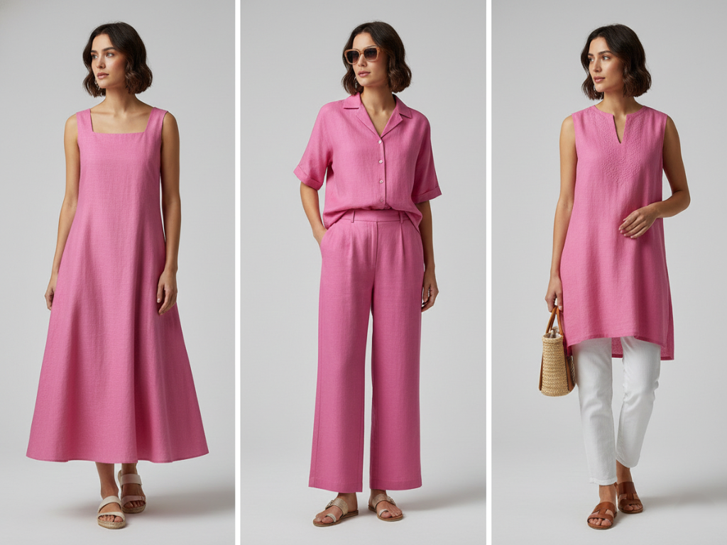 Uses: Given its bright pink color, linen composition, and apparent drape, this fabric would be highly versatile. Here are some potential uses: