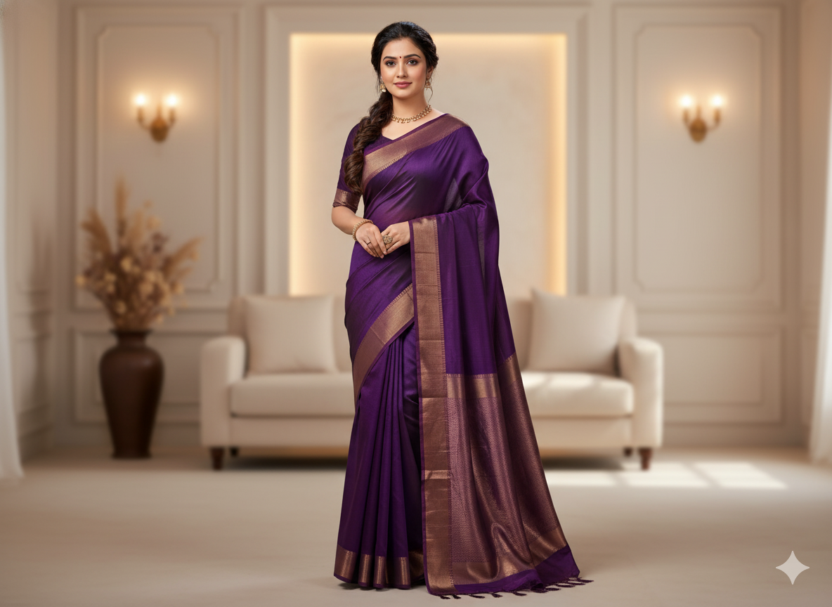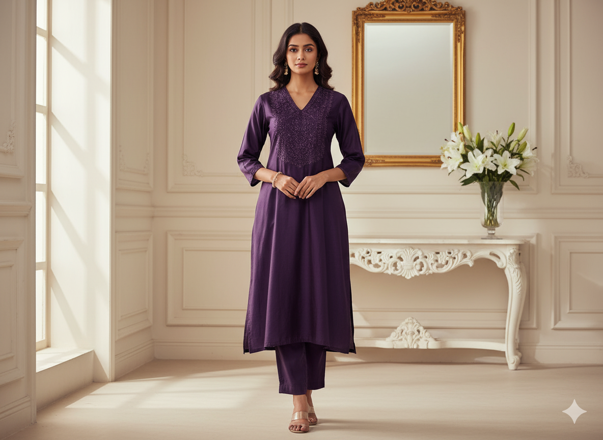 प्लेन प्योर विस्कोस गाजी सिल्क फैब्रिक एक शानदार, मुलायम कपड़ा है जो रेशम की नाजुक चमक को विस्कोस की चिकनी बनावट के साथ जोड़ता है। गाजी सिल्क, एक प्रकार का उच्च गुणवत्ता वाला रेशम है, जिसे एक सूक्ष्म चमकदार फिनिश के साथ एक समृद्ध, चिकनी सतह बनाने के लिए बुना जाता है। यह कपड़ा हल्का है, फिर भी इसमें घना, संरचित एहसास है, जो इसे औपचारिक और अर्ध-औपचारिक दोनों तरह के परिधानों में खूबसूरती से लपेटने के लिए आदर्श बनाता है।