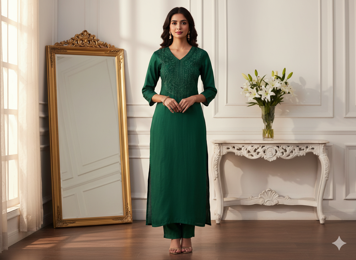 प्लेन प्योर विस्कोस गाजी सिल्क फैब्रिक एक शानदार, मुलायम कपड़ा है जो रेशम की नाजुक चमक को विस्कोस की चिकनी बनावट के साथ जोड़ता है। गाजी सिल्क, एक प्रकार का उच्च गुणवत्ता वाला रेशम है, जिसे एक सूक्ष्म चमकदार फिनिश के साथ एक समृद्ध, चिकनी सतह बनाने के लिए बुना जाता है। यह कपड़ा हल्का है, फिर भी इसमें घना, संरचित एहसास है, जो इसे औपचारिक और अर्ध-औपचारिक दोनों तरह के परिधानों में खूबसूरती से लपेटने के लिए आदर्श बनाता है।