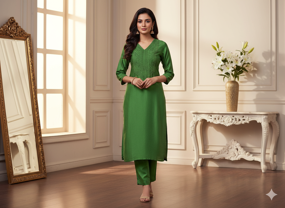प्लेन प्योर विस्कोस गाजी सिल्क फैब्रिक एक शानदार, मुलायम कपड़ा है जो रेशम की नाजुक चमक को विस्कोस की चिकनी बनावट के साथ जोड़ता है। गाजी सिल्क, एक प्रकार का उच्च गुणवत्ता वाला रेशम है, जिसे एक सूक्ष्म चमकदार फिनिश के साथ एक समृद्ध, चिकनी सतह बनाने के लिए बुना जाता है। यह कपड़ा हल्का है, फिर भी इसमें घना, संरचित एहसास है, जो इसे औपचारिक और अर्ध-औपचारिक दोनों तरह के परिधानों में खूबसूरती से लपेटने के लिए आदर्श बनाता है।