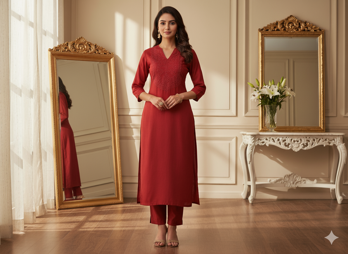 प्लेन प्योर विस्कोस गाजी सिल्क फैब्रिक एक शानदार, मुलायम कपड़ा है जो रेशम की नाजुक चमक को विस्कोस की चिकनी बनावट के साथ जोड़ता है। गाजी सिल्क, एक प्रकार का उच्च गुणवत्ता वाला रेशम है, जिसे एक सूक्ष्म चमकदार फिनिश के साथ एक समृद्ध, चिकनी सतह बनाने के लिए बुना जाता है। यह कपड़ा हल्का है, फिर भी इसमें घना, संरचित एहसास है, जो इसे औपचारिक और अर्ध-औपचारिक दोनों तरह के परिधानों में खूबसूरती से लपेटने के लिए आदर्श बनाता है।