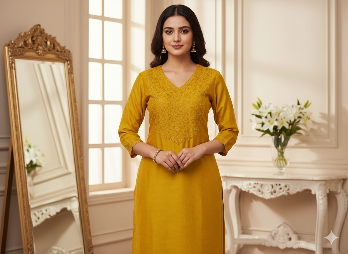 प्लेन प्योर विस्कोस गाजी सिल्क फैब्रिक एक शानदार, मुलायम कपड़ा है जो रेशम की नाजुक चमक को विस्कोस की चिकनी बनावट के साथ जोड़ता है। गाजी सिल्क, एक प्रकार का उच्च गुणवत्ता वाला रेशम है, जिसे एक सूक्ष्म चमकदार फिनिश के साथ एक समृद्ध, चिकनी सतह बनाने के लिए बुना जाता है। यह कपड़ा हल्का है, फिर भी इसमें घना, संरचित एहसास है, जो इसे औपचारिक और अर्ध-औपचारिक दोनों तरह के परिधानों में खूबसूरती से लपेटने के लिए आदर्श बनाता है।
