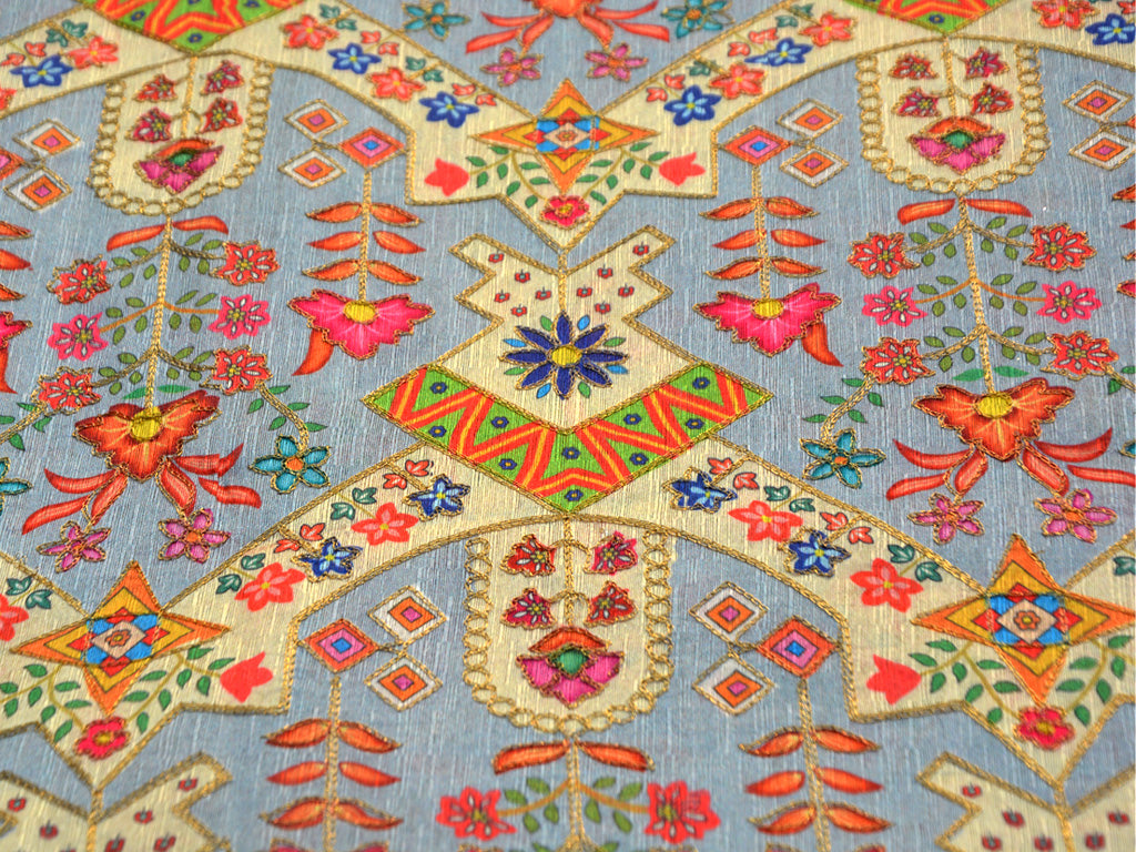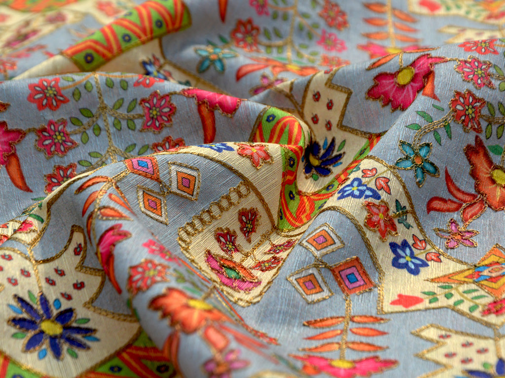ग्रे मल्टीकलर पारंपरिक डिजिटल प्रिंट ज़री कढ़ाई शहतूत रेशम कपड़ा