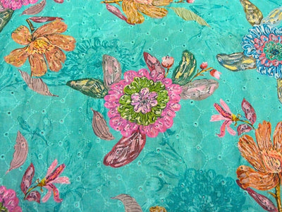 Teal Green 100 % Pure Cotton Chikan Embroidered Fabric