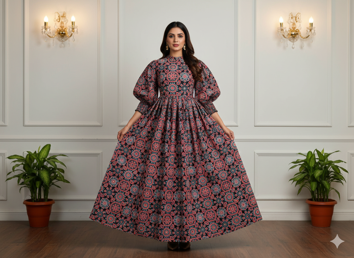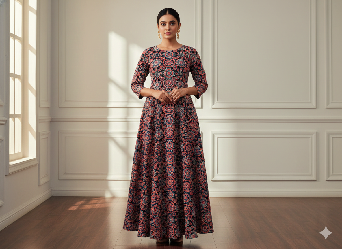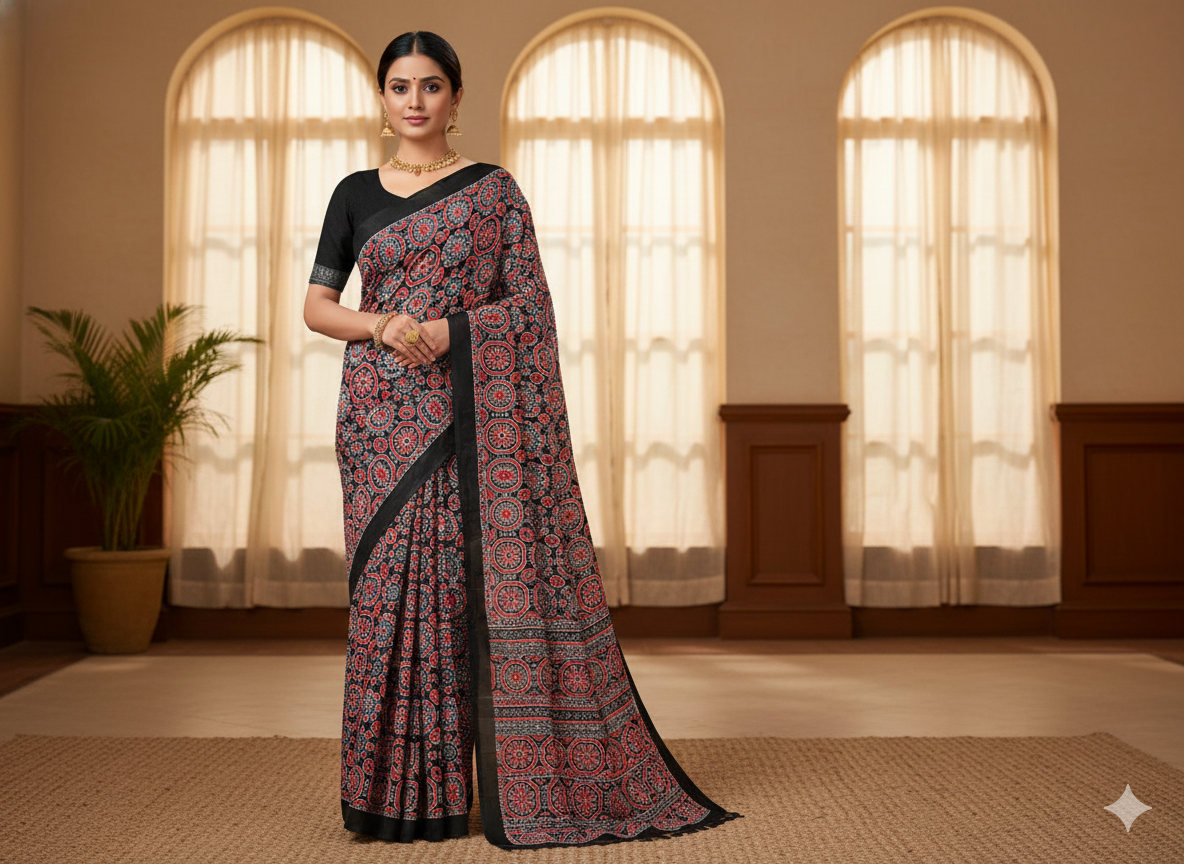 काला और लाल अजरख डिजिटल प्रिंटेड प्रीमियम बटर क्रेप फ़ैब्रिक