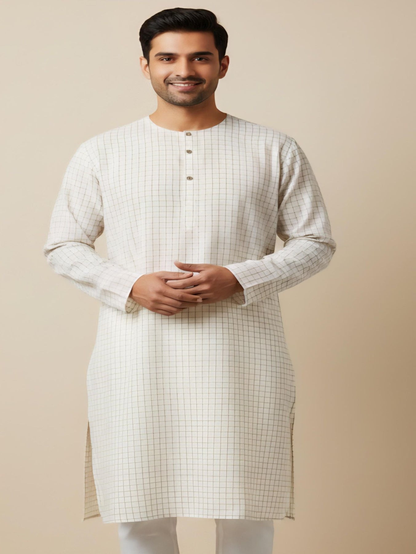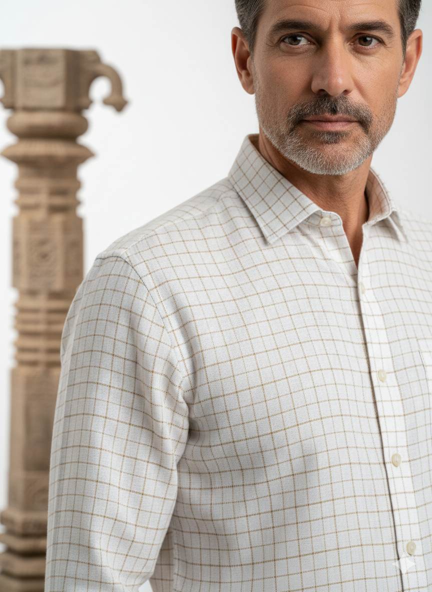 Introducing our Off white Cotton Linen shirt with Khakee Checks. This timeless pattern is a staple in any wardrobe, adding a touch of sophistication to any outfit. Made with high-quality materials, this shirt is perfect for any occasion and will never go out of style. Elevate your wardrobe and make a lasting impression with this versatile and classic piece.