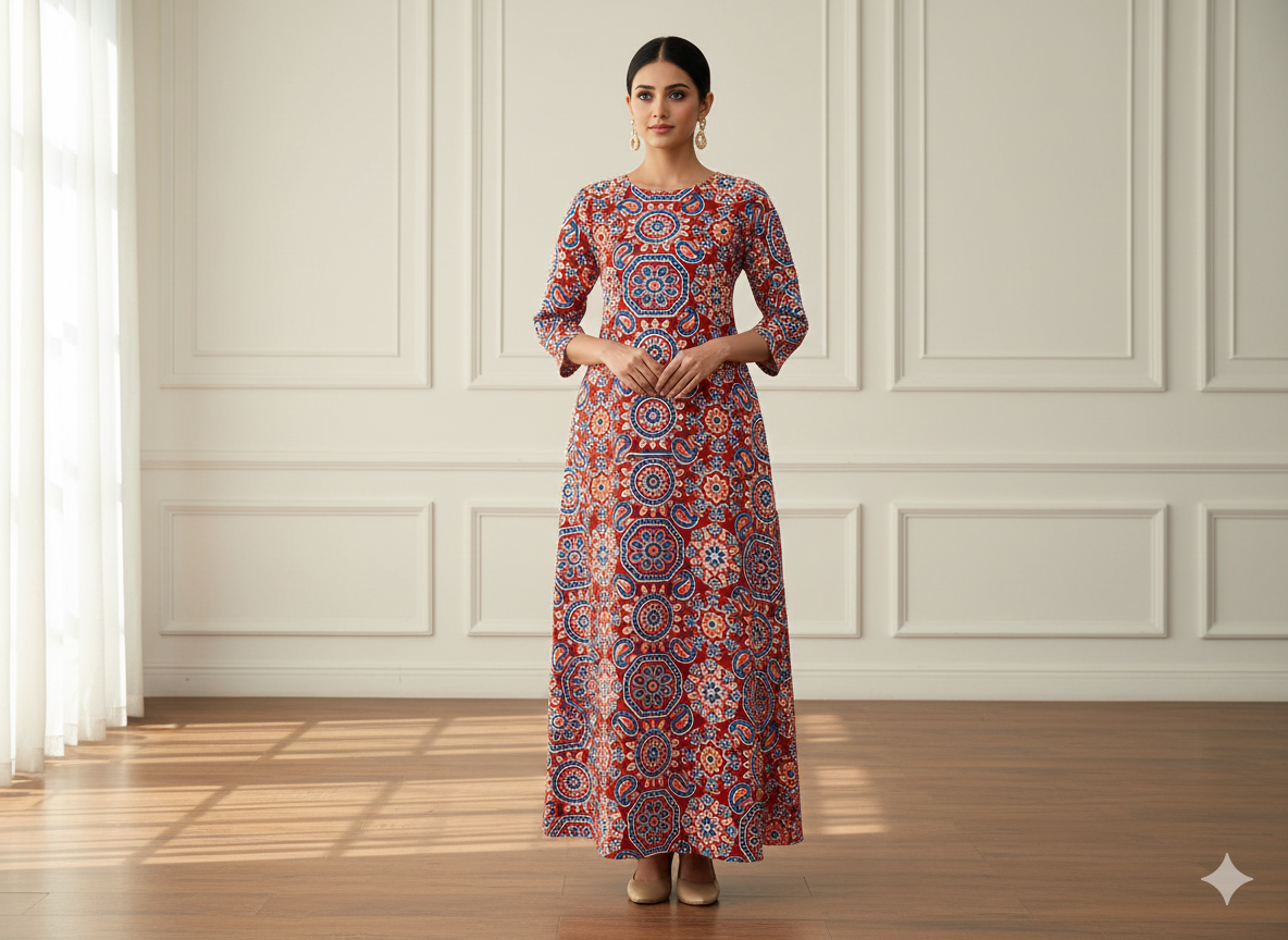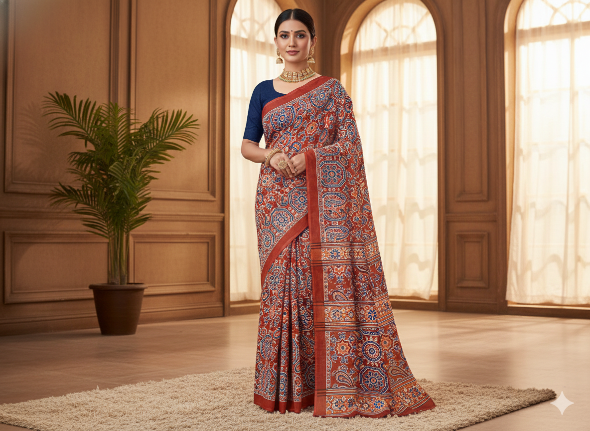 लाल बहुरंगी पारंपरिक डिजिटल मुद्रित प्रीमियम बटर क्रेप फ़ैब्रिक