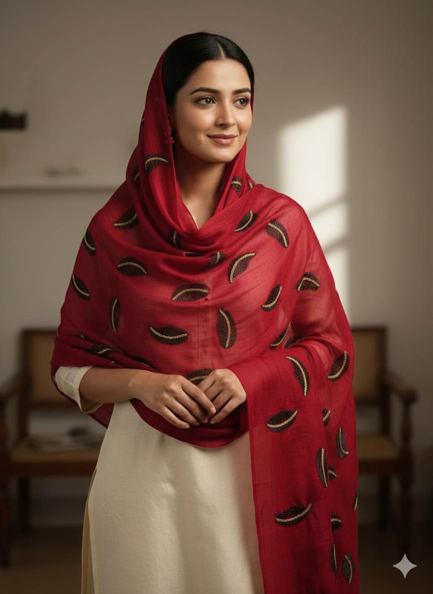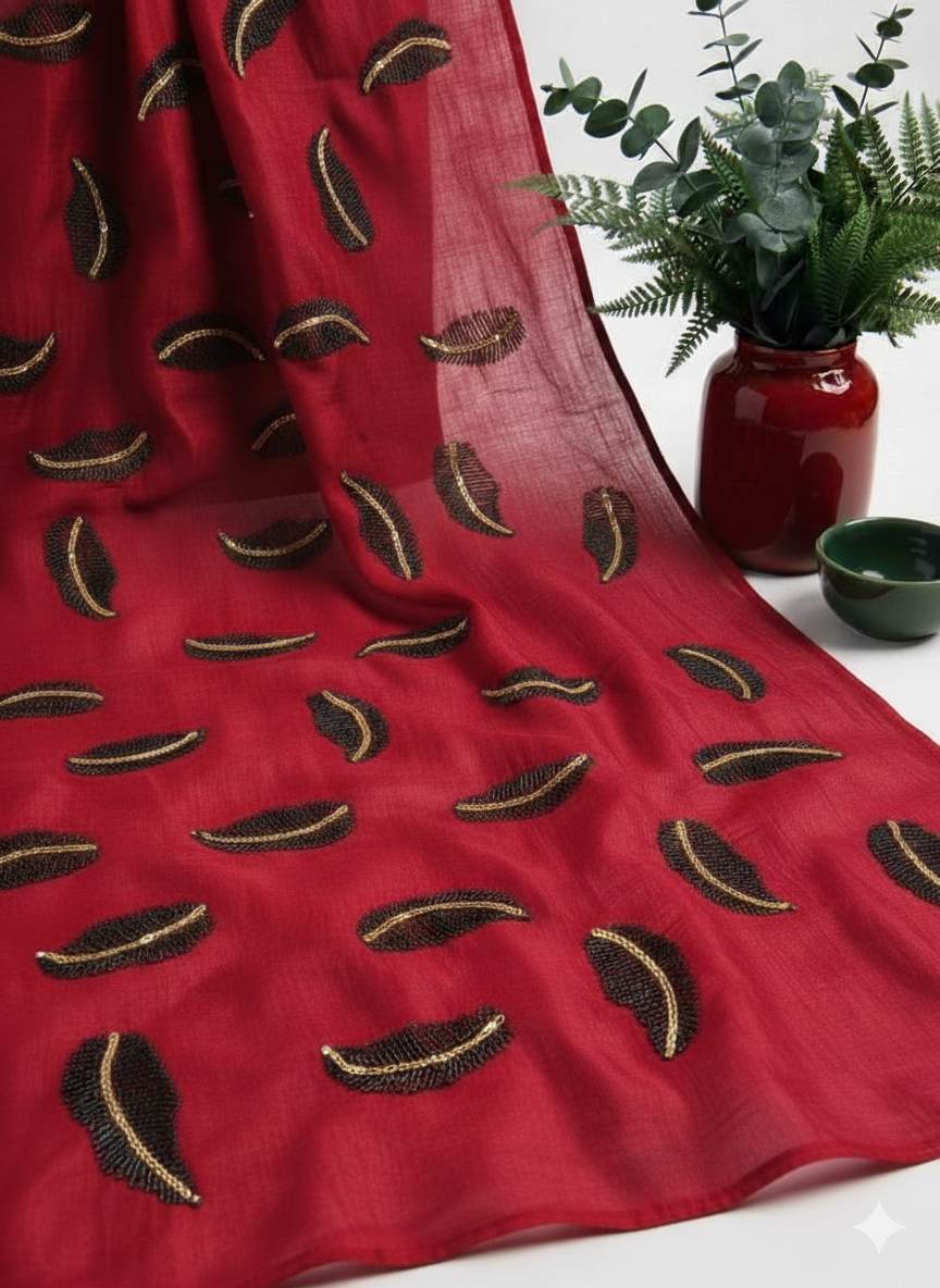 Red Chanderi Silk Fabric With Black Leaf & Golden Sequence Motif Embroidery Fabric