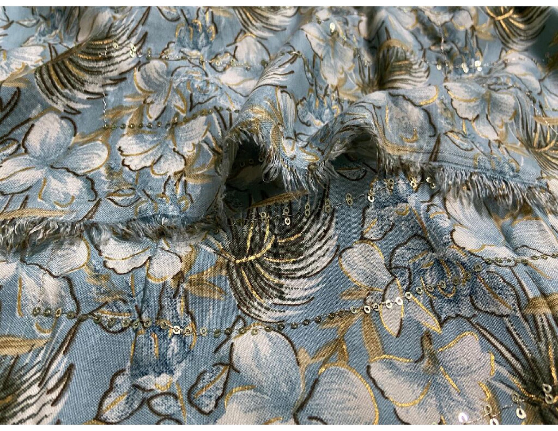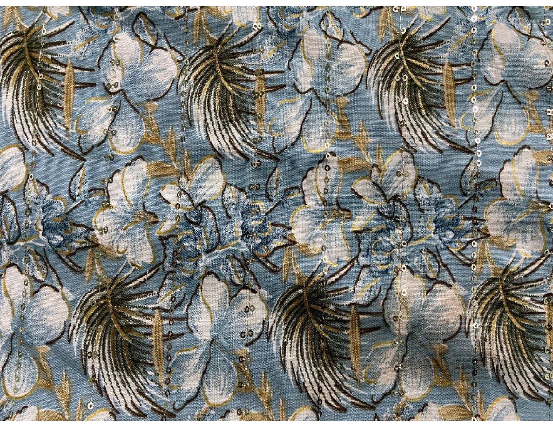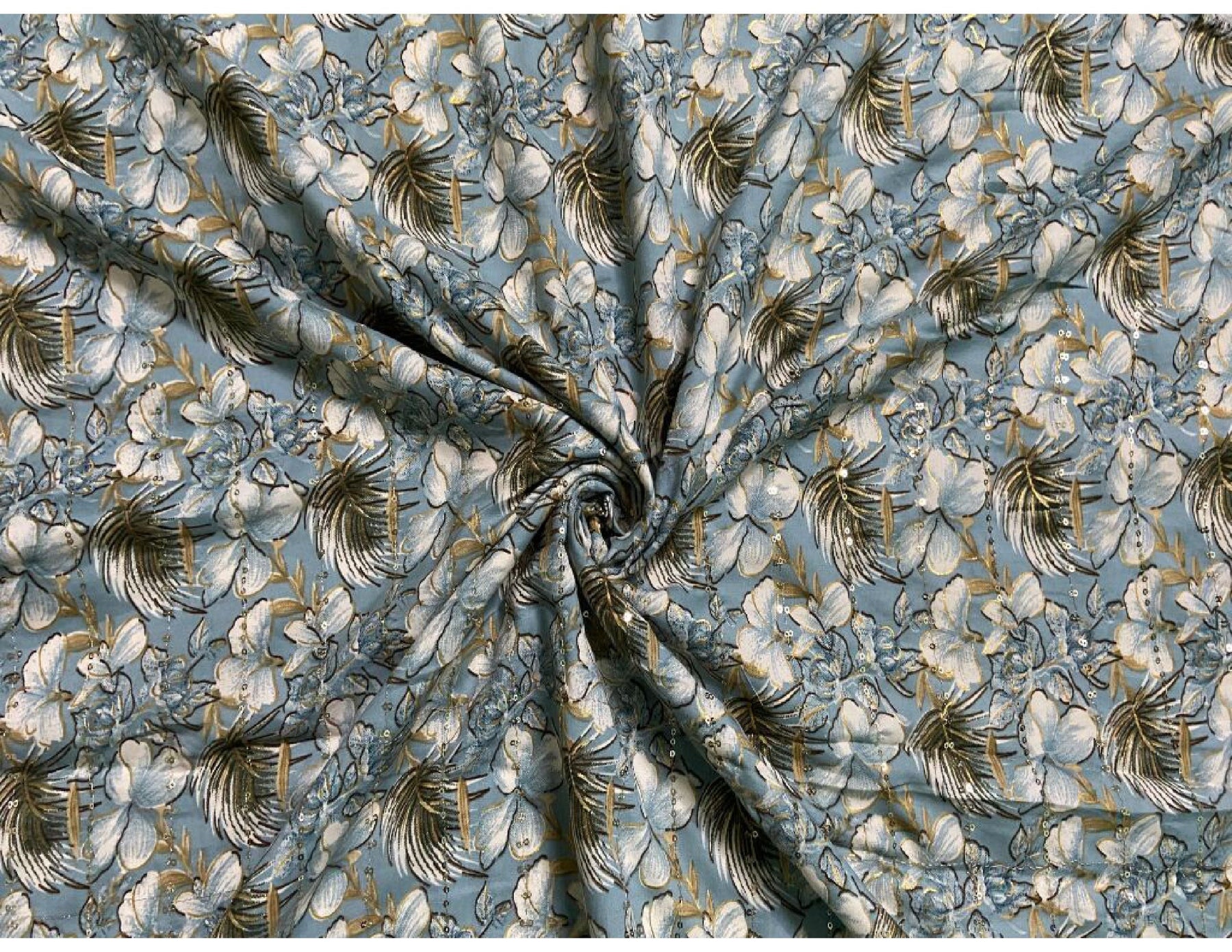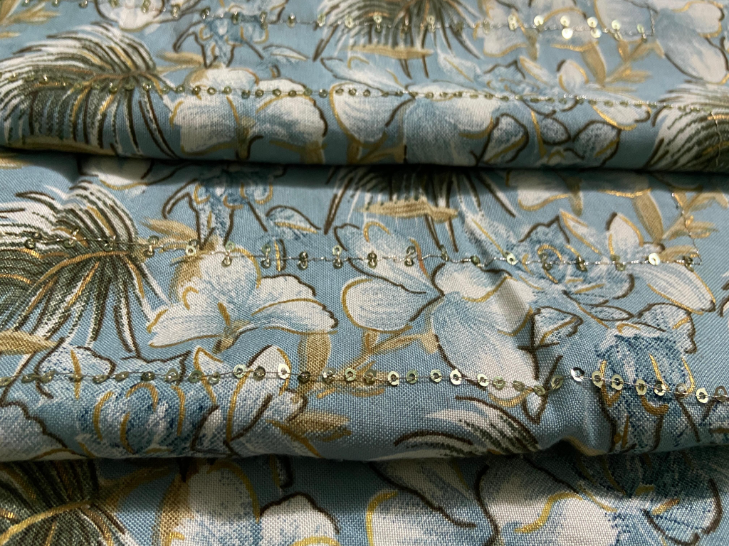 Elegant dusty sky blue cotton fabric featuring soft floral digital prints enhanced with delicate embroidery and subtle vertical sequin detailing. Breathable, lightweight, and perfect for festive and designer wear.