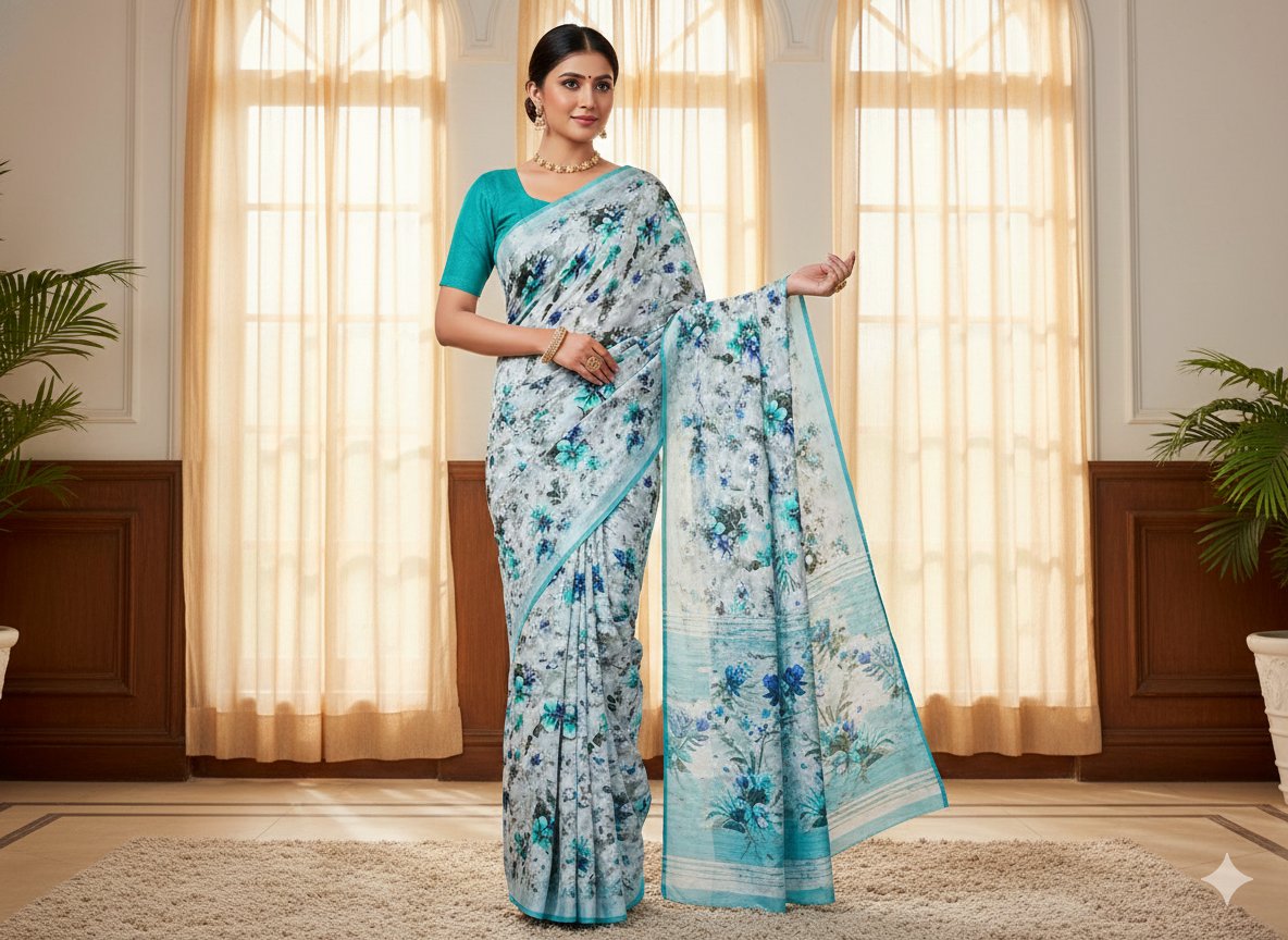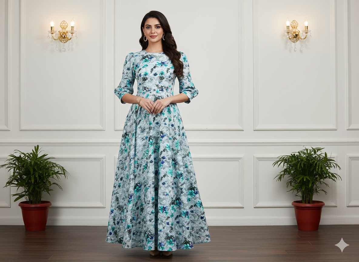 नीला और सफेद पुष्प डिजिटल मुद्रित प्रीमियम बटर क्रेप कपड़ा