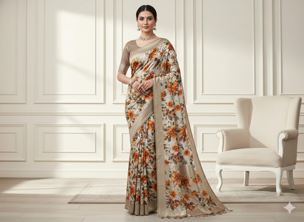 क्रीम और पीला पुष्प डिजिटल मुद्रित प्रीमियम बटर क्रेप कपड़ा