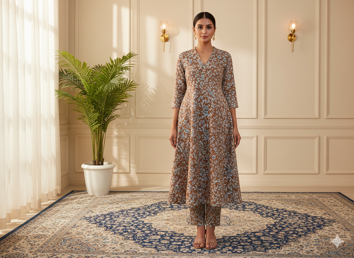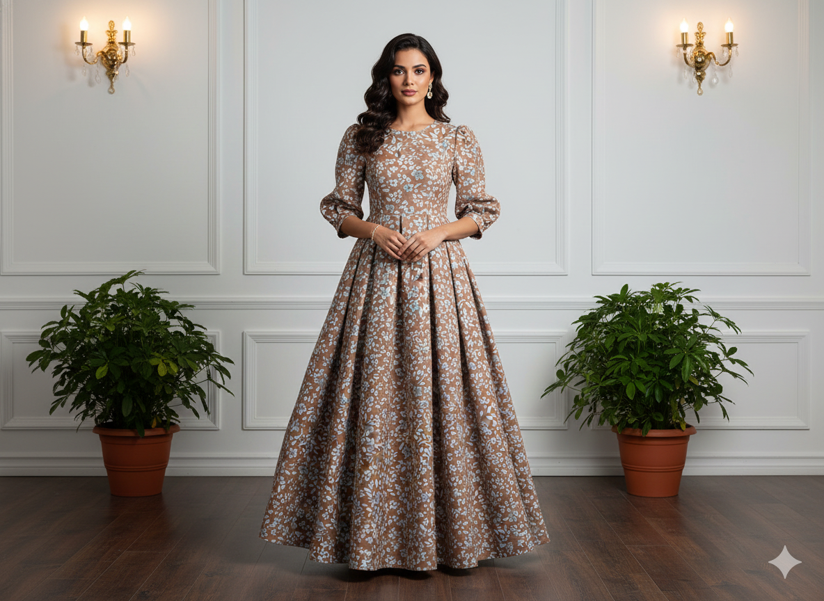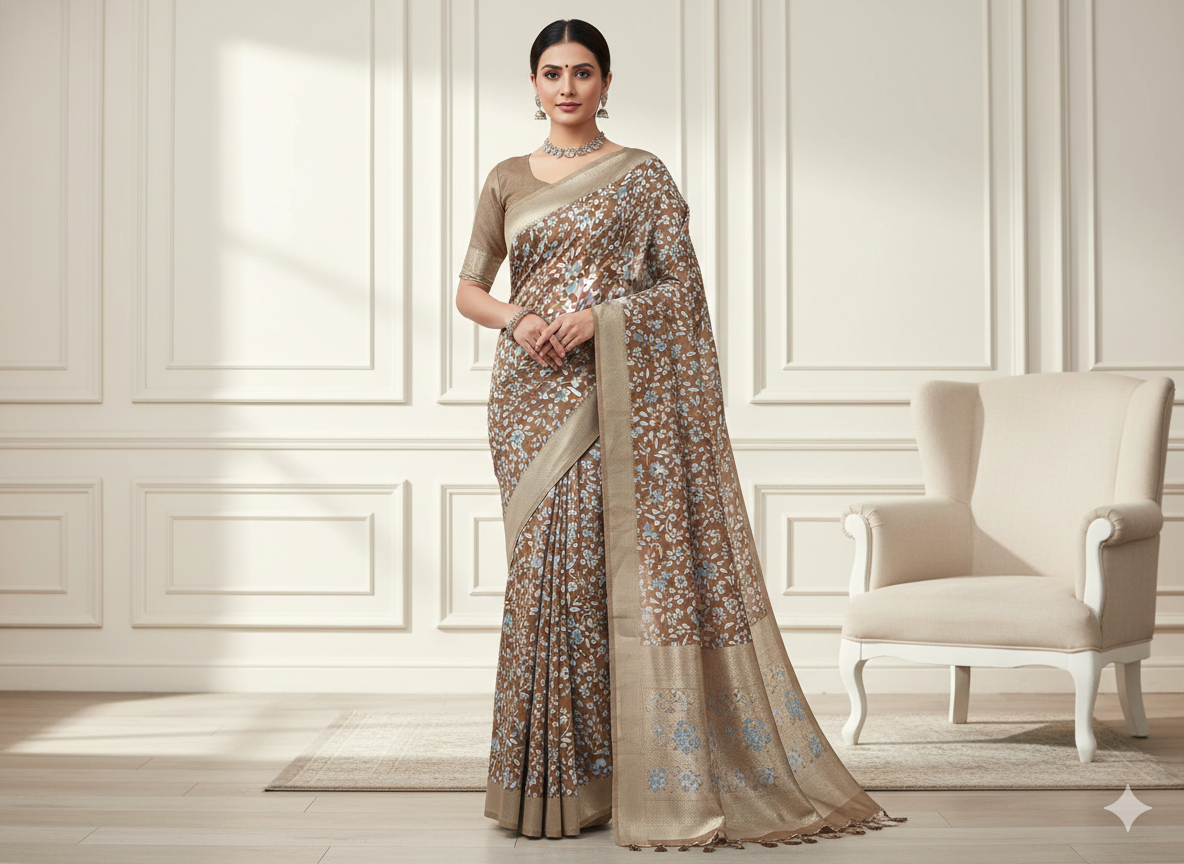 पेस्टल ब्राउन फ्लोरल डिजिटल प्रिंटेड प्रीमियम बटर क्रेप फ़ैब्रिक