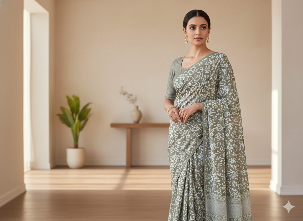 ग्रेइश ग्रीन फ्लोरल डिजिटल प्रिंटेड प्रीमियम बटर क्रेप फ़ैब्रिक