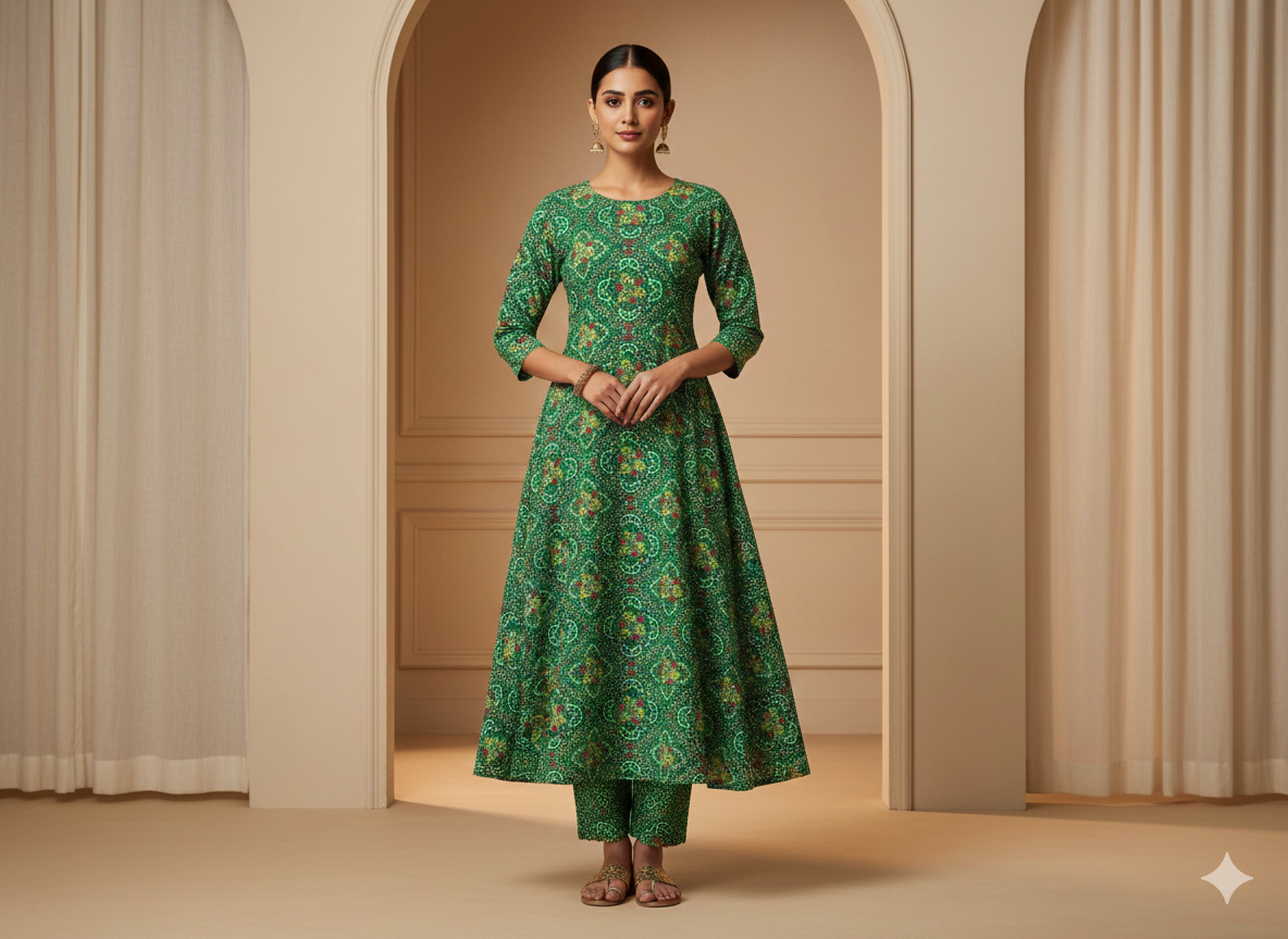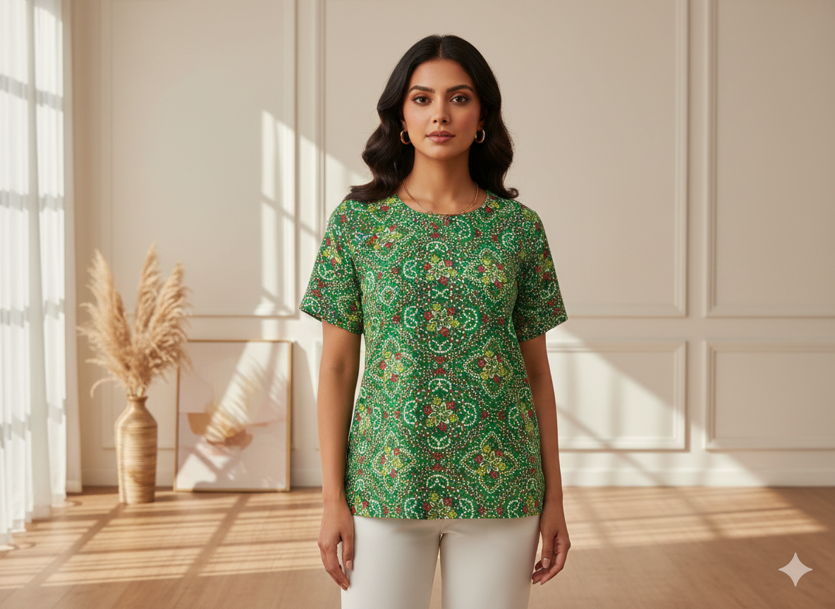 पन्ना हरा बांधनी पुष्प डिजिटल मुद्रित प्रीमियम बटर क्रेप फैब्रिक