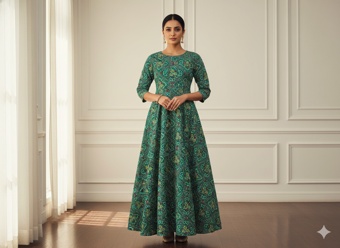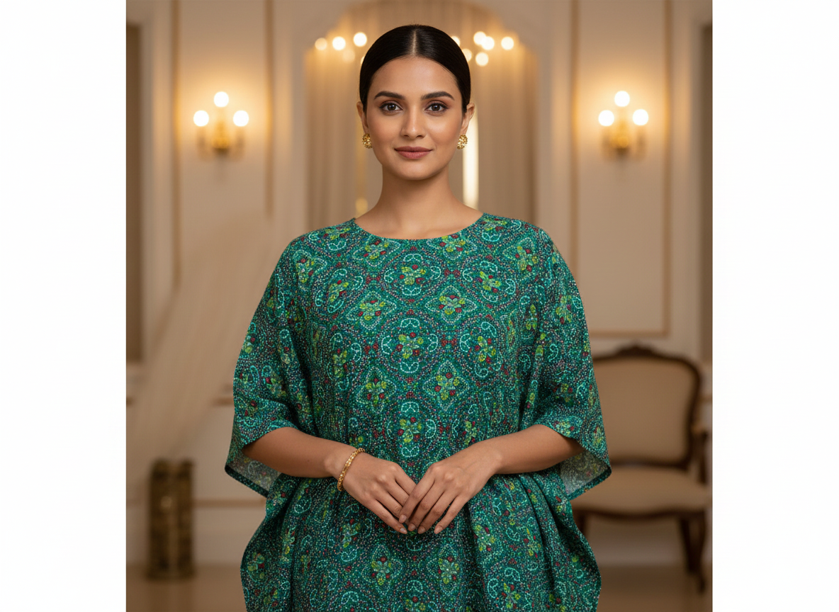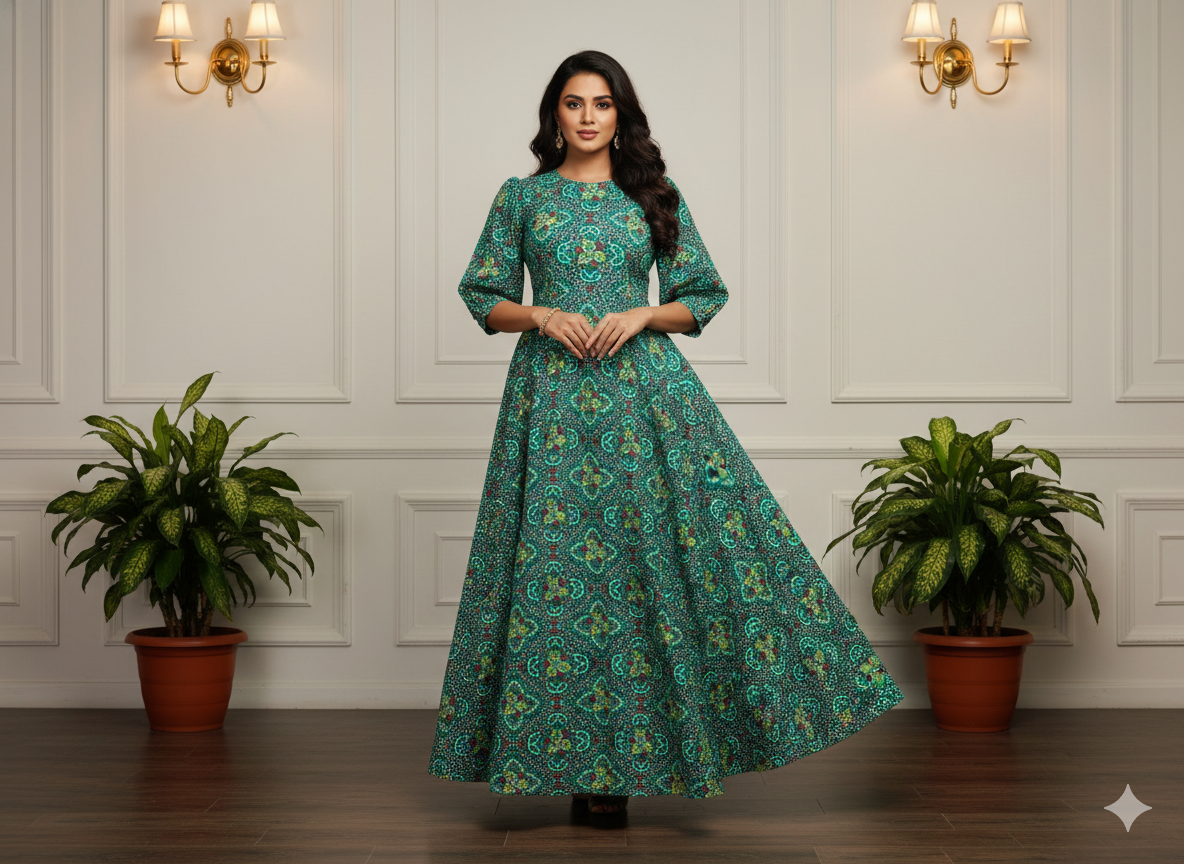 मजेदार ग्रीन बांधनी फ्लोरल डिजिटल प्रिंटेड प्रीमियम बटर क्रेप फ़ैब्रिक