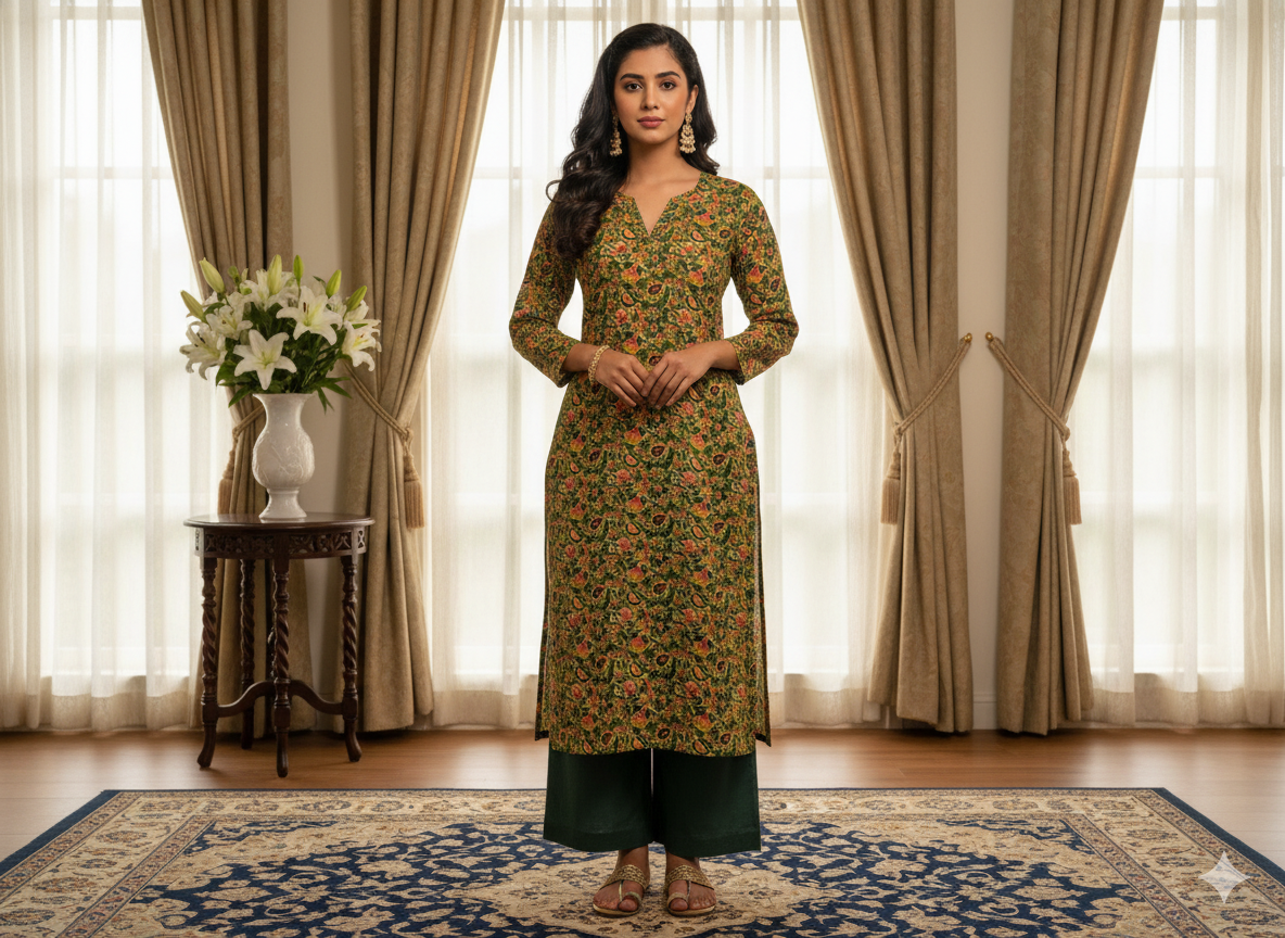 100% pure cotton, this floral handblocked fabric carries the charm of traditional artistry with modern elegance. The soft, breathable texture makes it perfect for everyday wear, while the intricate handblock prints add a touch of timeless beauty. Ideal for creating kurtas, dresses, tops, or home furnishings, this fabric blends comfort with a naturally elegant appeal.