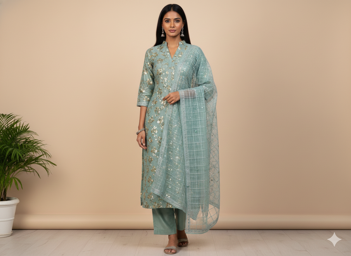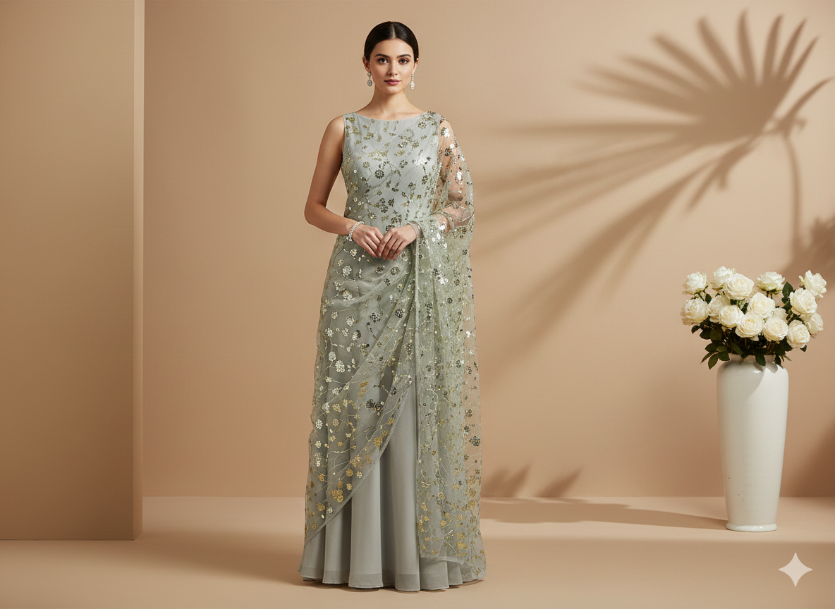 मिंट ग्रीन फ्लोरल सेक्विन कढ़ाई ऑर्गेना फैब्रिक