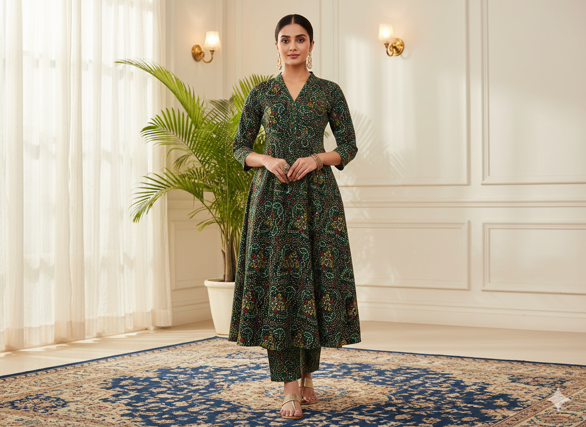 समुद्री शैवाल हरा बांधनी पुष्प डिजिटल मुद्रित प्रीमियम मक्खन क्रेप कपड़ा