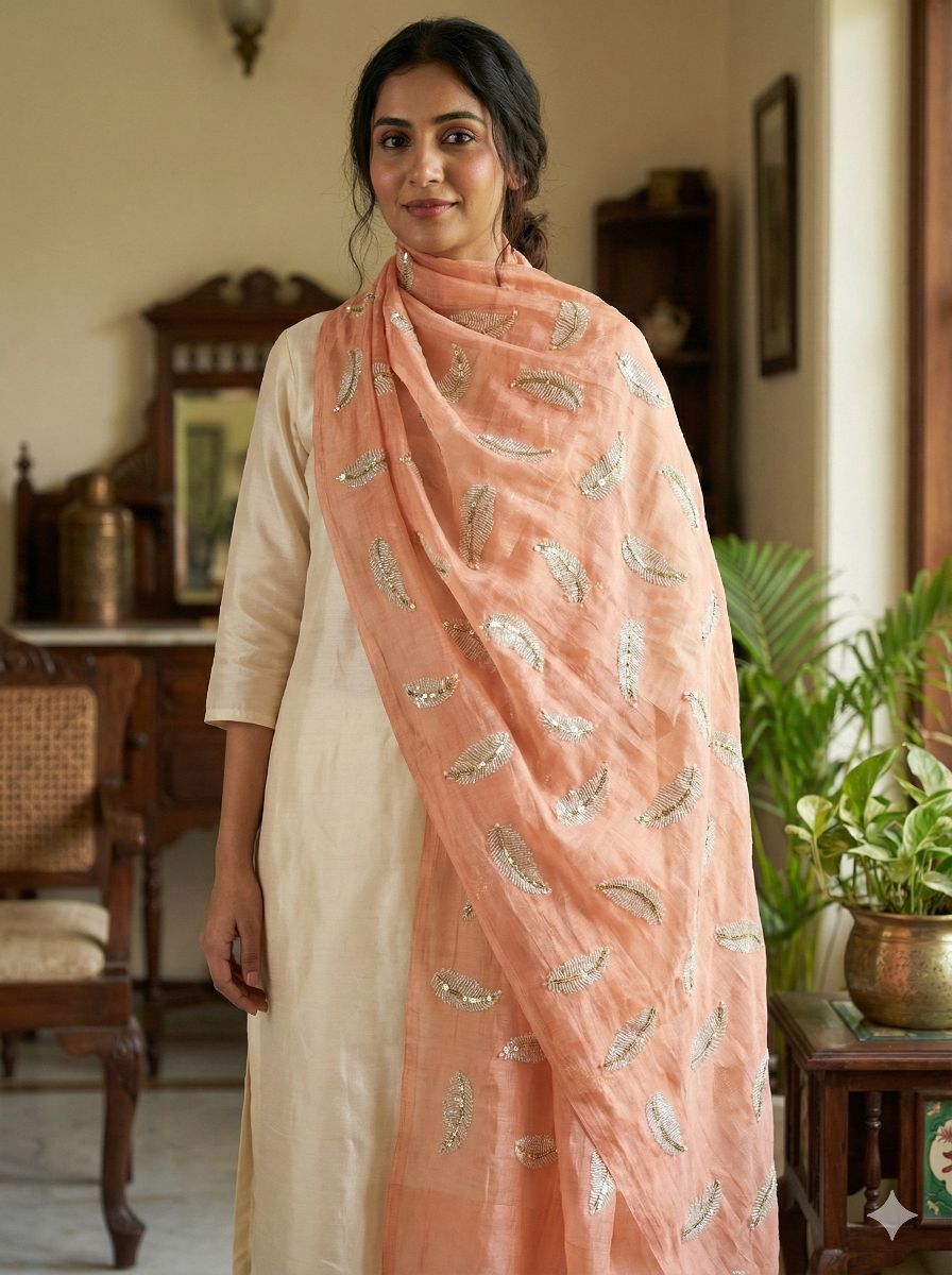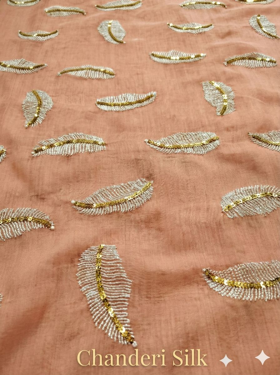 Peach Chanderi Silk Fabric With White Leaf & Golden Sequence Motif Embroidery