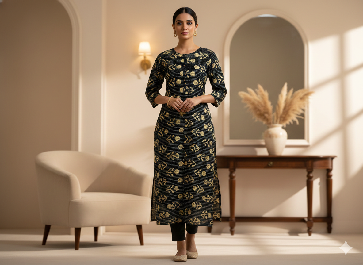 काला पुष्प शुद्ध कपास कांथा कपड़ा