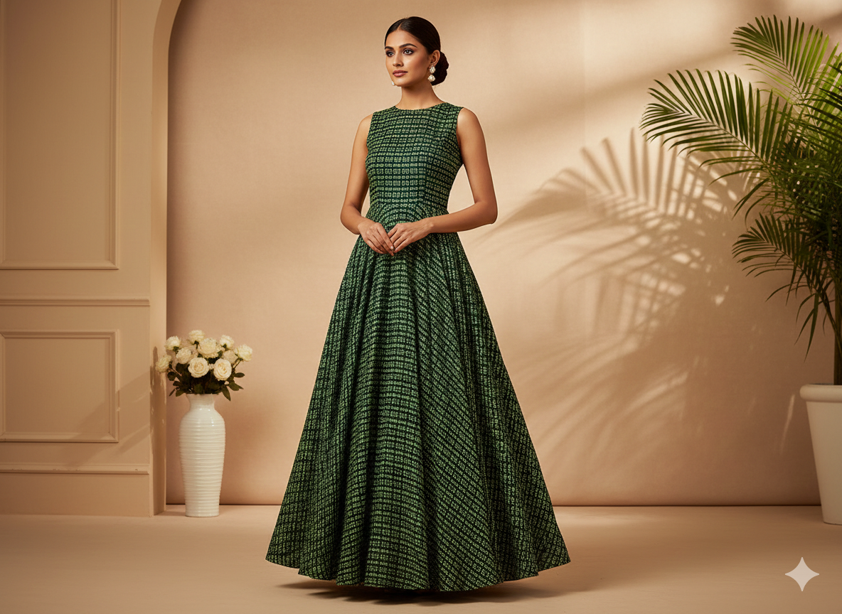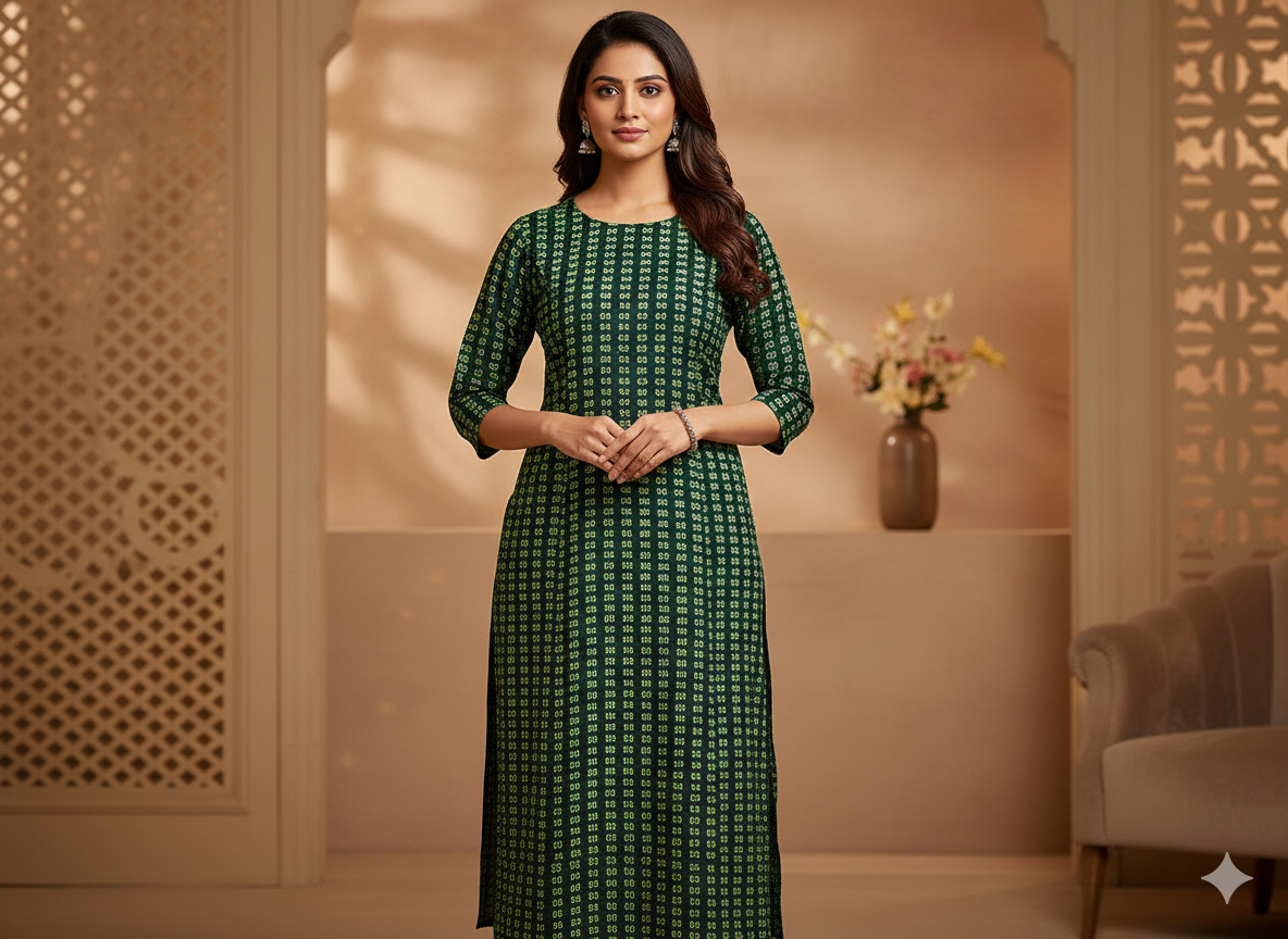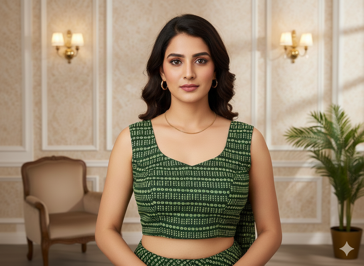 वन हरा बांधनी प्रिंट अर्ध सूती कपड़ा