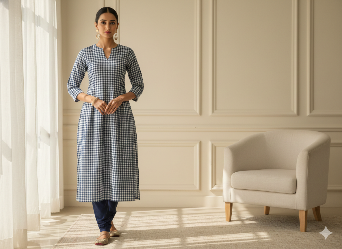 नीले चेक यार्न रंगे शुद्ध सूती कपड़ा