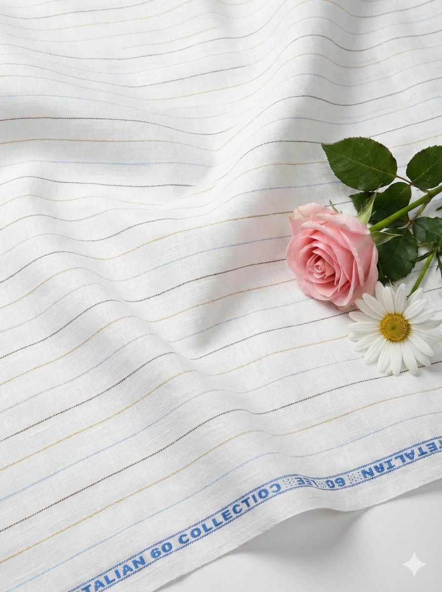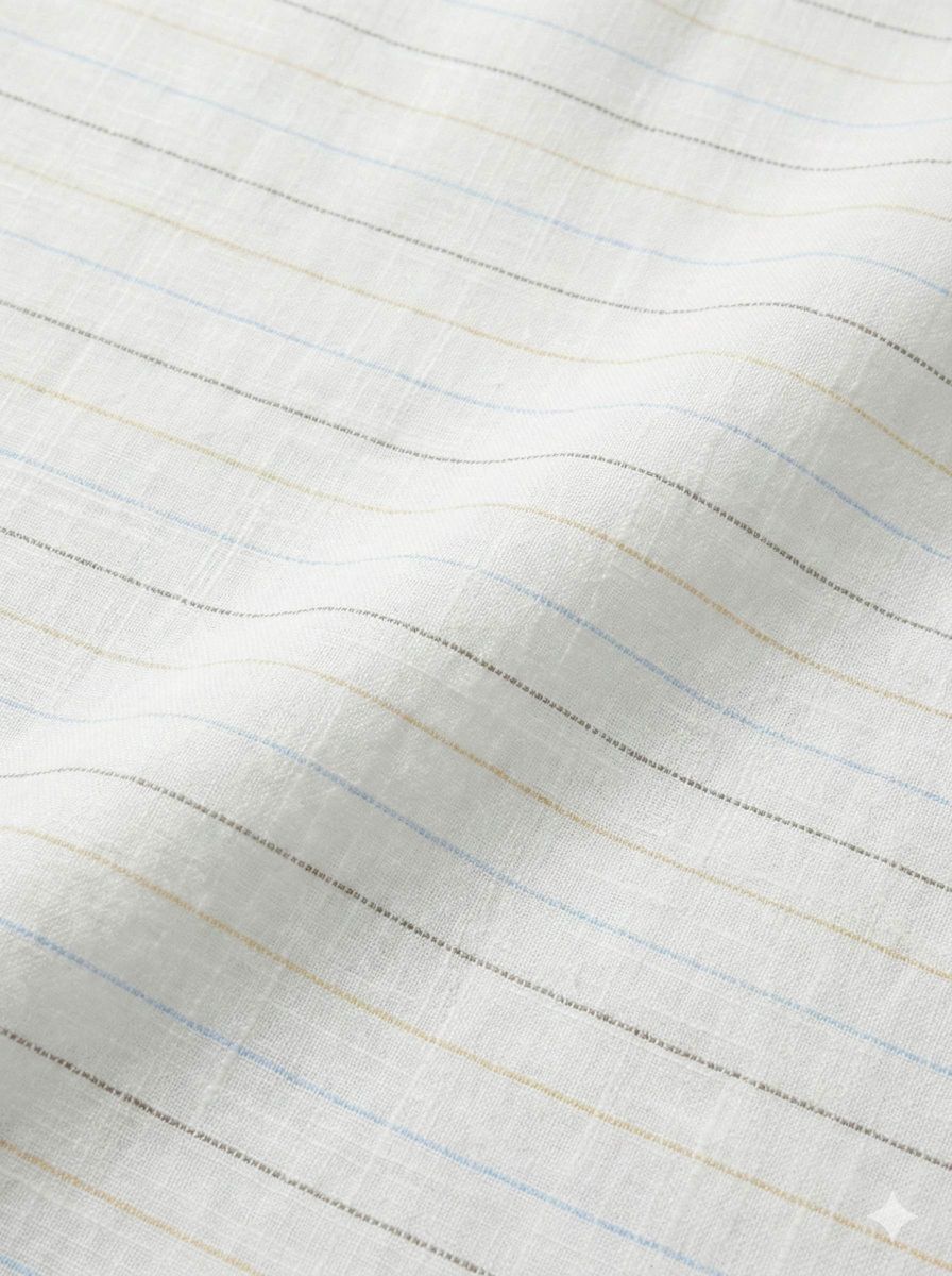 Experience ultimate comfort and style with our Off White Cotton Linen. This versatile fabric is perfect for all your wardrobe needs. Its breathable material and subtle grey and blue thin lines give a modern and sophisticated touch to any outfit. Upgrade your wardrobe today!