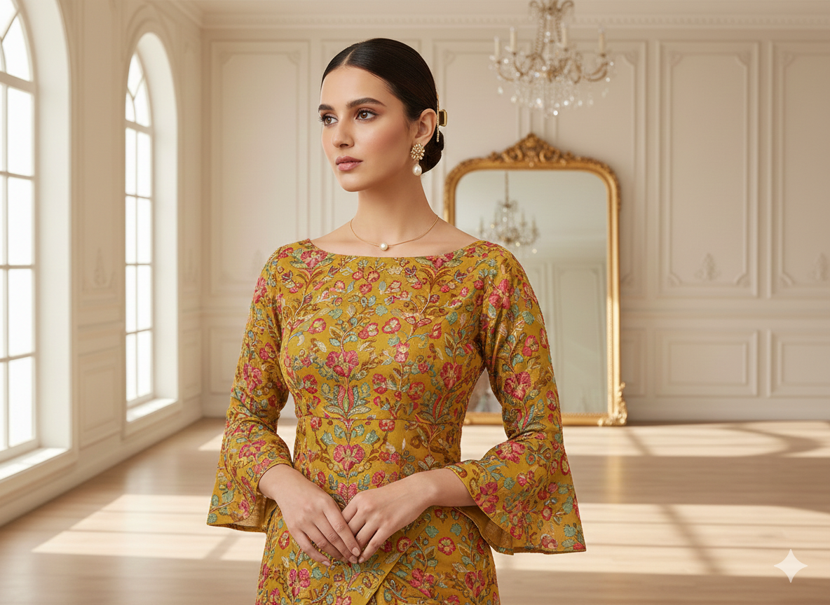 चमकीले पीले पत्ते पारंपरिक दमन लिनेन वर्क जॉर्जेट फैब्रिक के साथ
