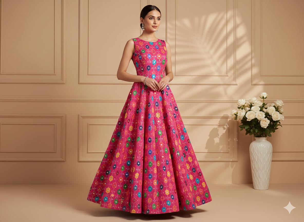 गहरे गुलाबी ज्यामितीय सेक्विन कढ़ाई शहतूत रेशम कपड़ा