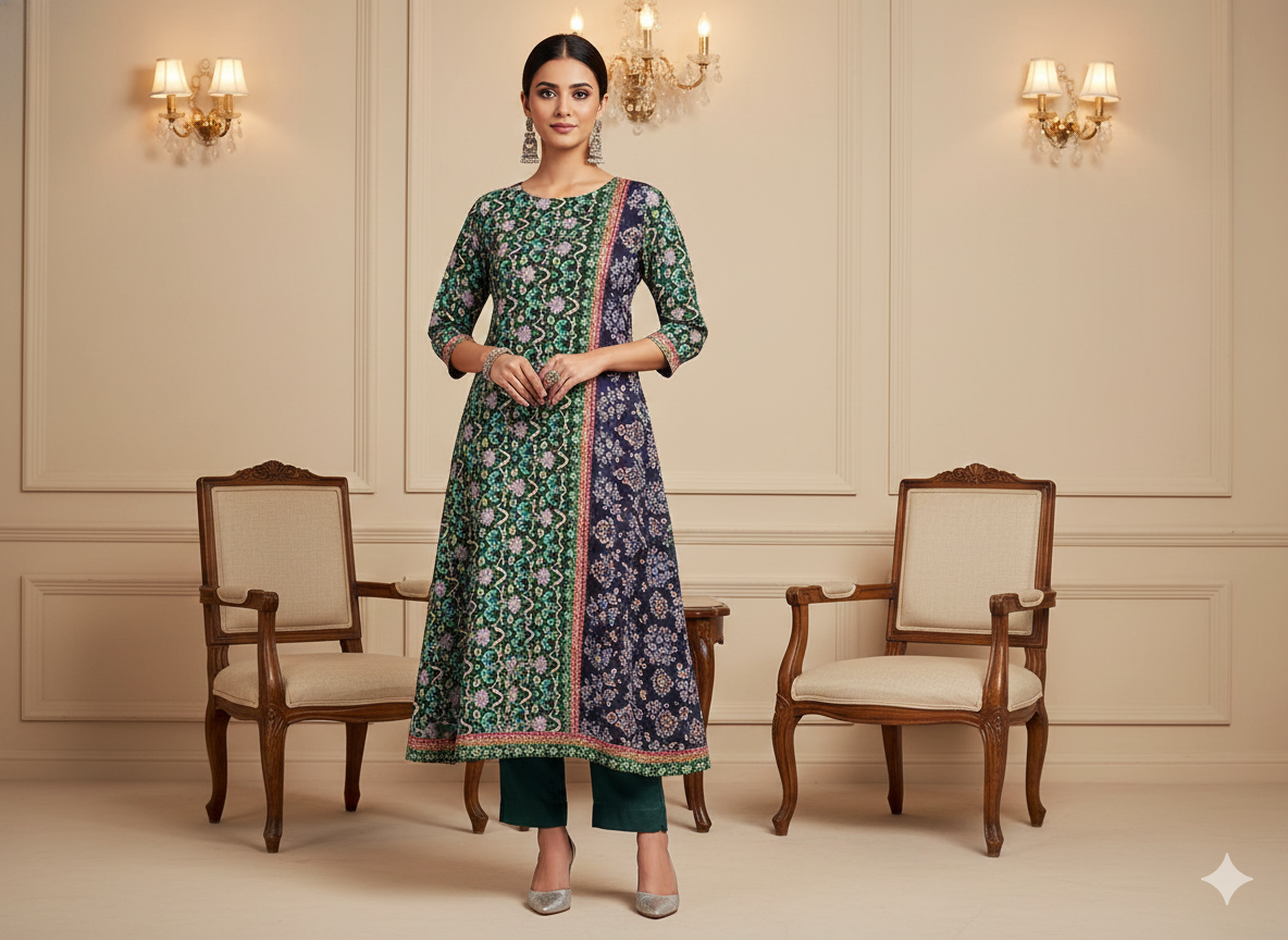 हरा और नीला पारंपरिक डिज़ाइन विस्कोस ऑर्गेना कपड़ा