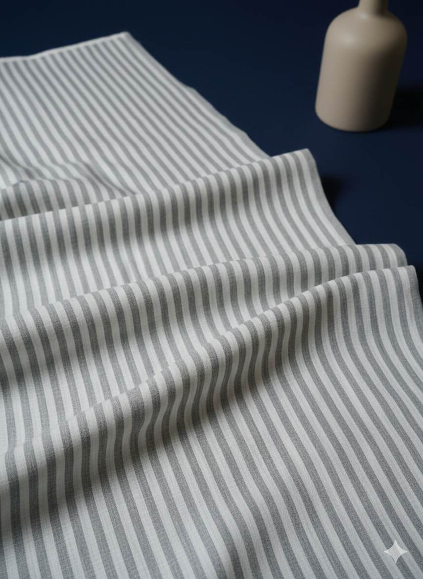 The grey & White Stripe Cotton Linen offers an appealing aesthetic ideal for enhancing professional attire. Crafted from a cotton-linen blend, this fabric provides breathability (up to 30% more than standard cotton) and comfort, making it suitable for prolonged wear in various environments. Its stylish stripe design contributes to a polished appearance.