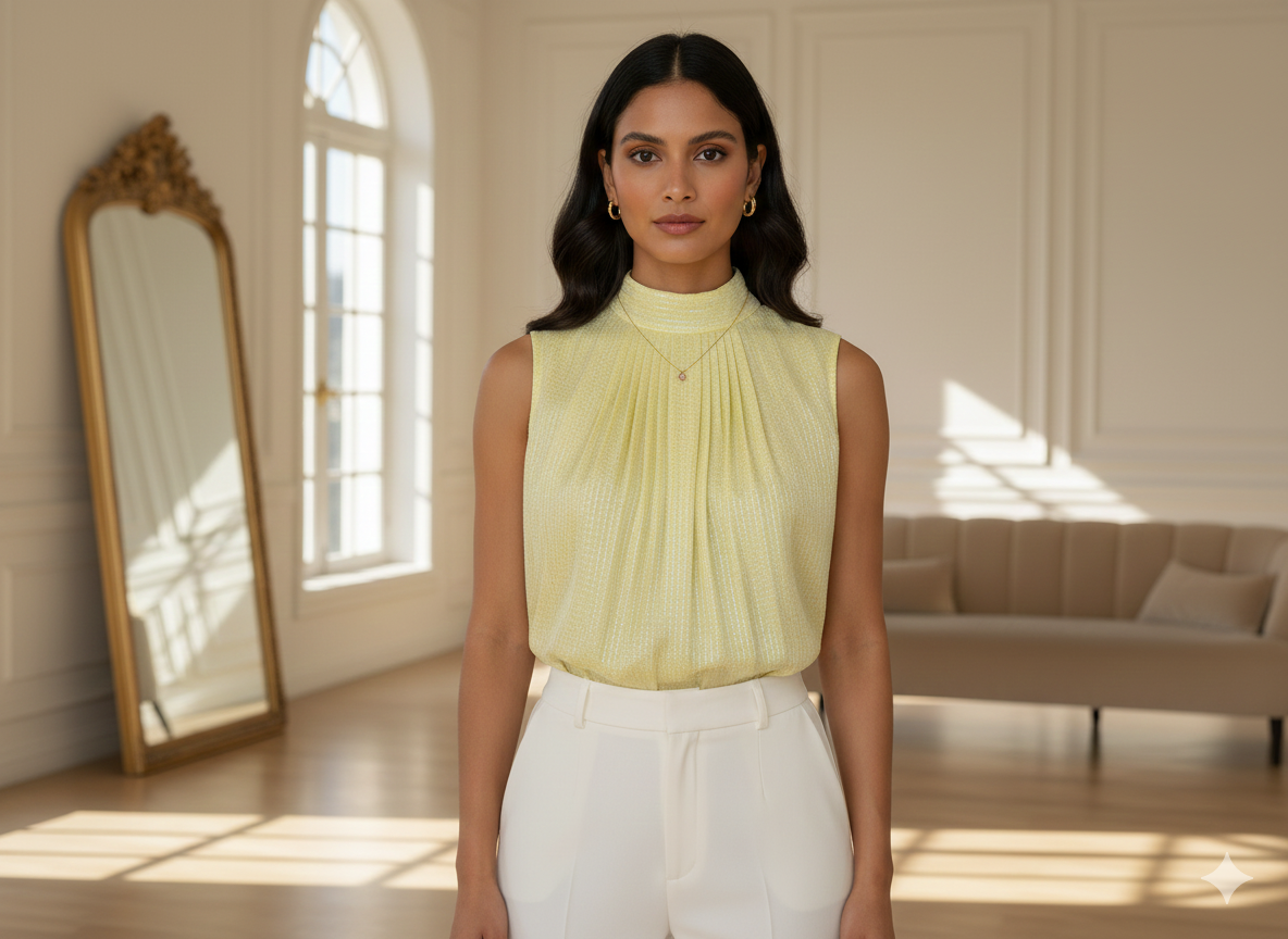 हल्के पीले रंग का रेनबो मेश शिमर इंटरलॉक बॉन्डिंग फ़ैब्रिक