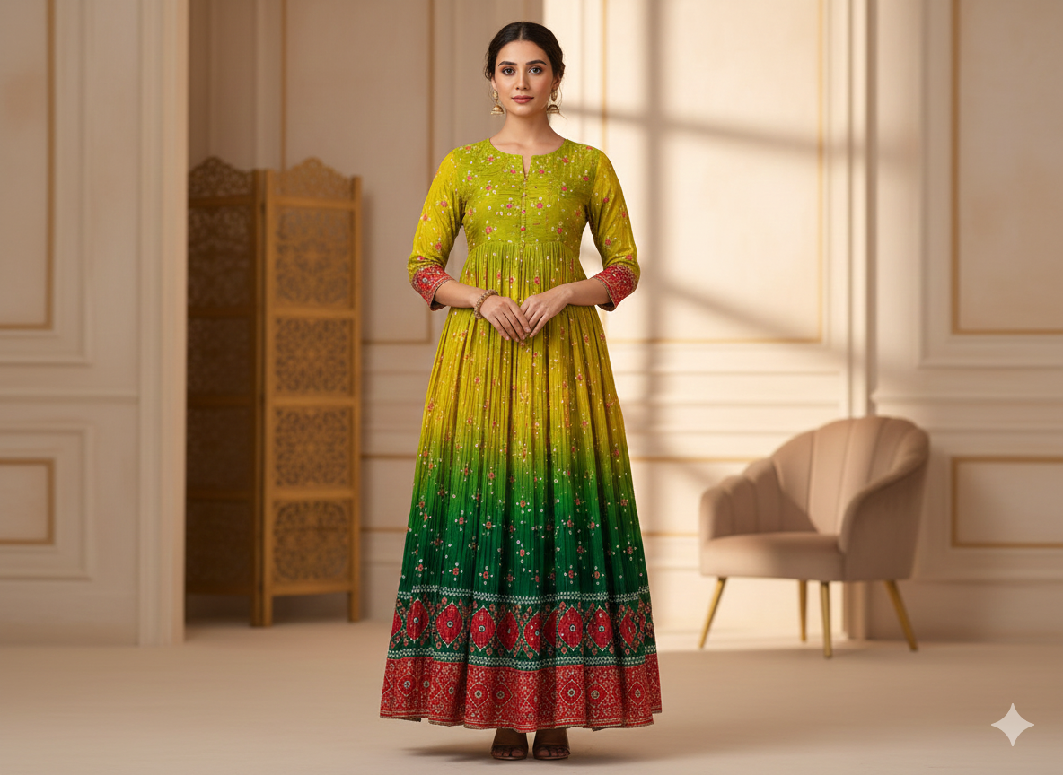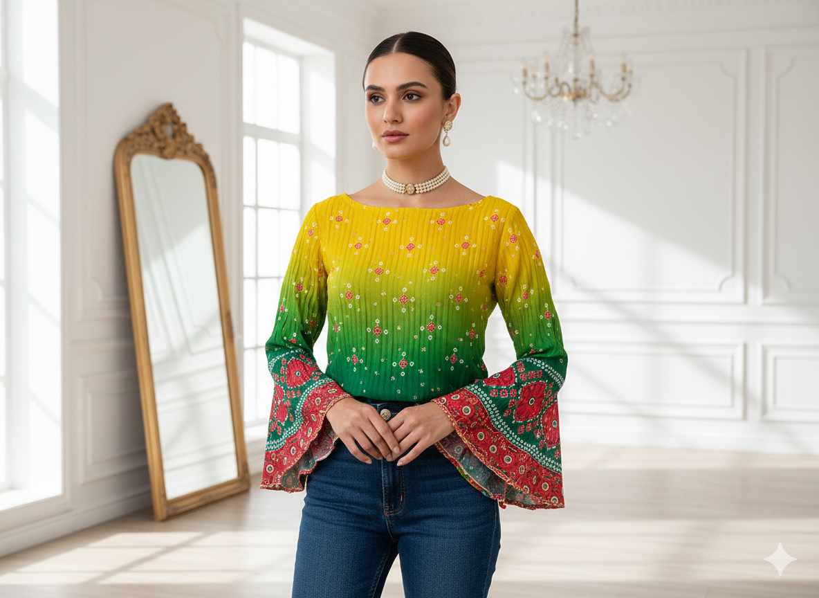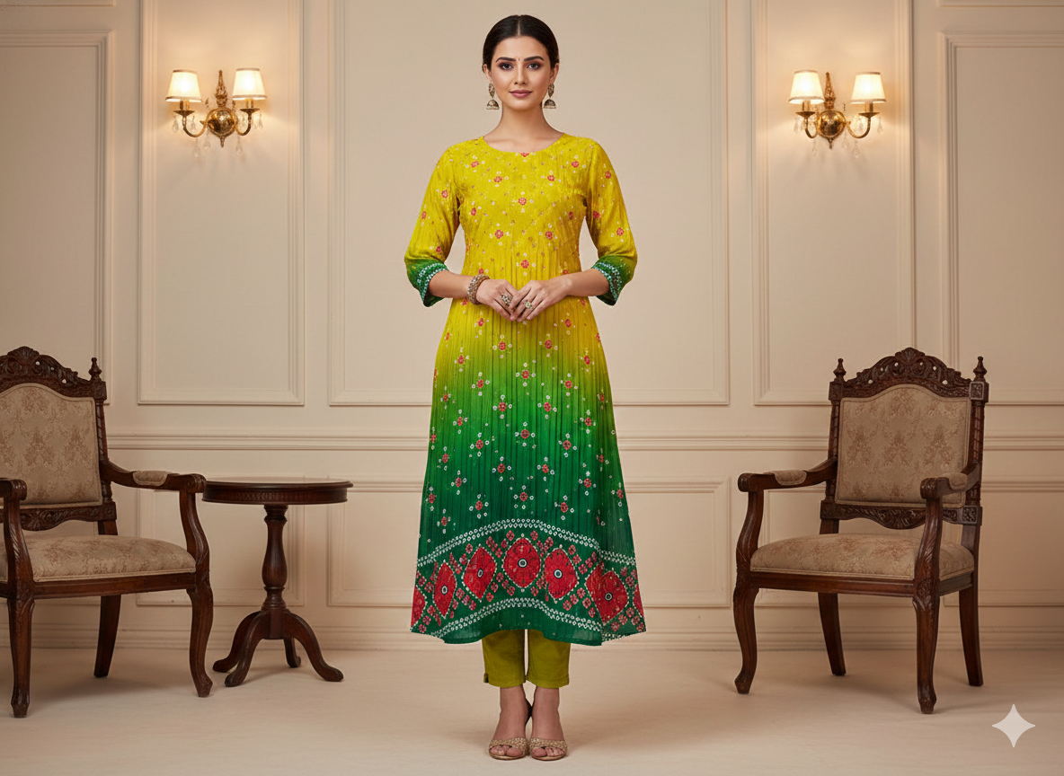 मल्टीकलर बांधनी एब्सट्रैक्ट डिजिटल प्रिंटेड बूटी चिनॉन फ़ैब्रिक के साथ