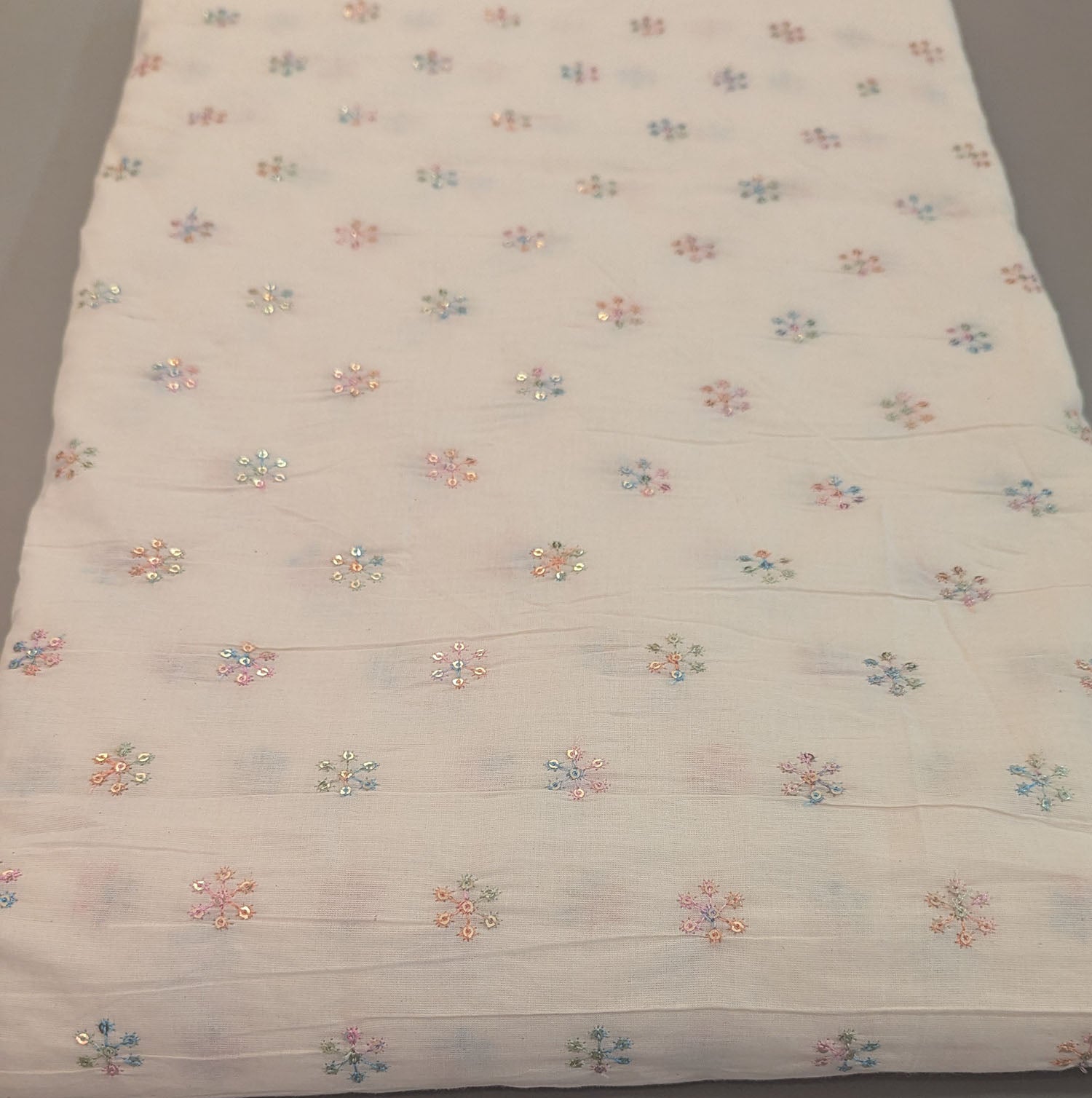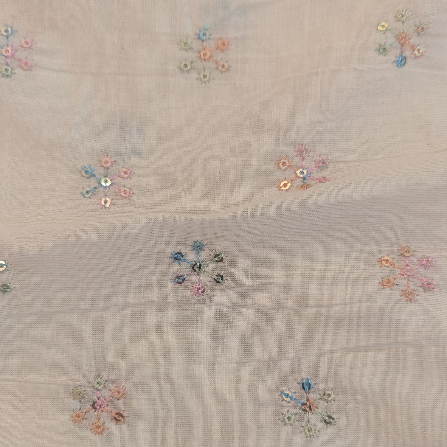 Off-White Natural Cotton Fabric with Pastel Hand Embroidery