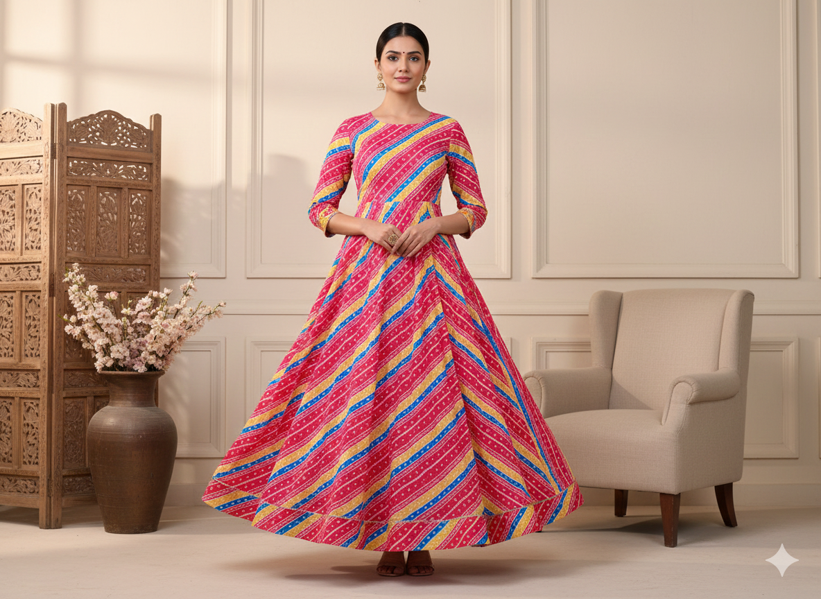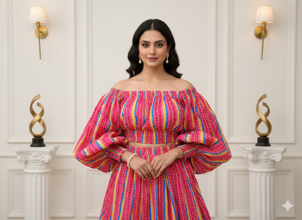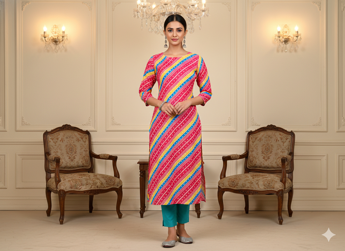 पिंक बंधनी स्ट्राइप्स प्रिंटेड चिनॉन फैब्रिक