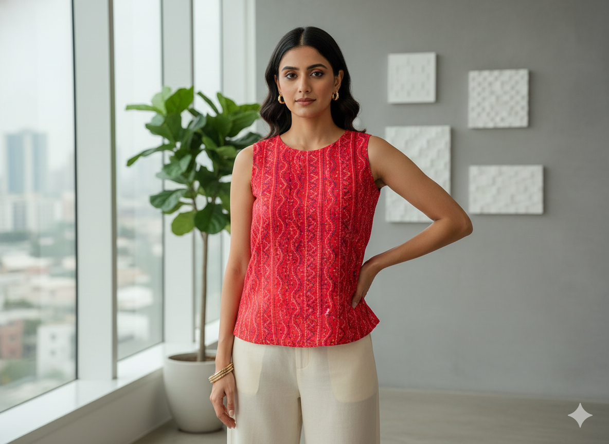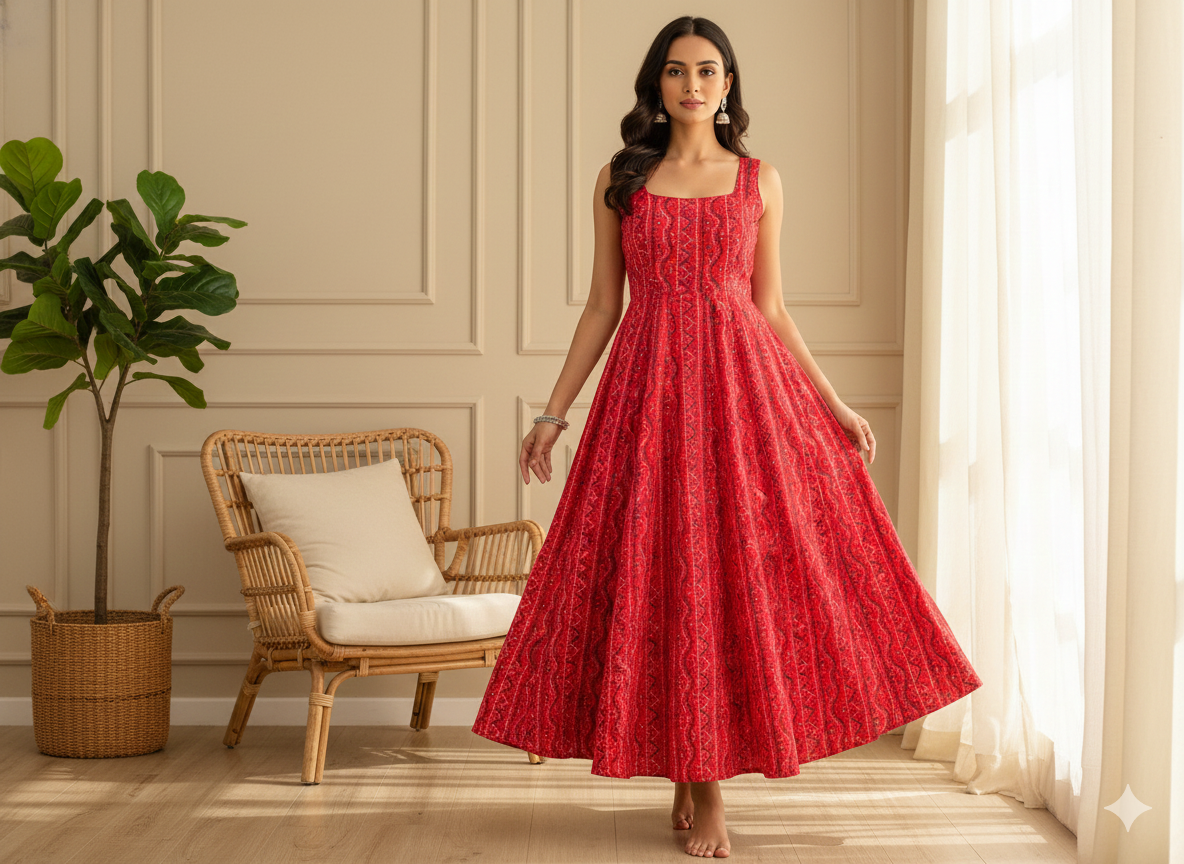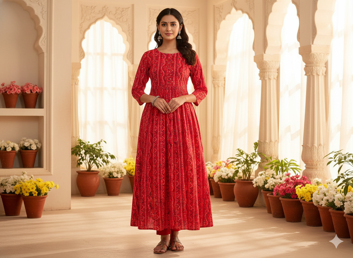 लाल सार बांधनी डिजिटल मुद्रित स्लब कॉटन फैब्रिक
