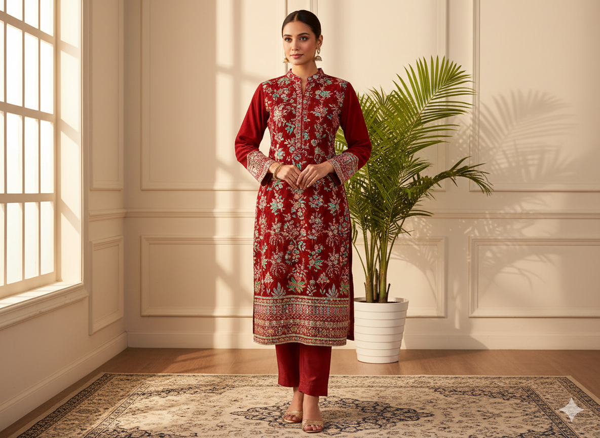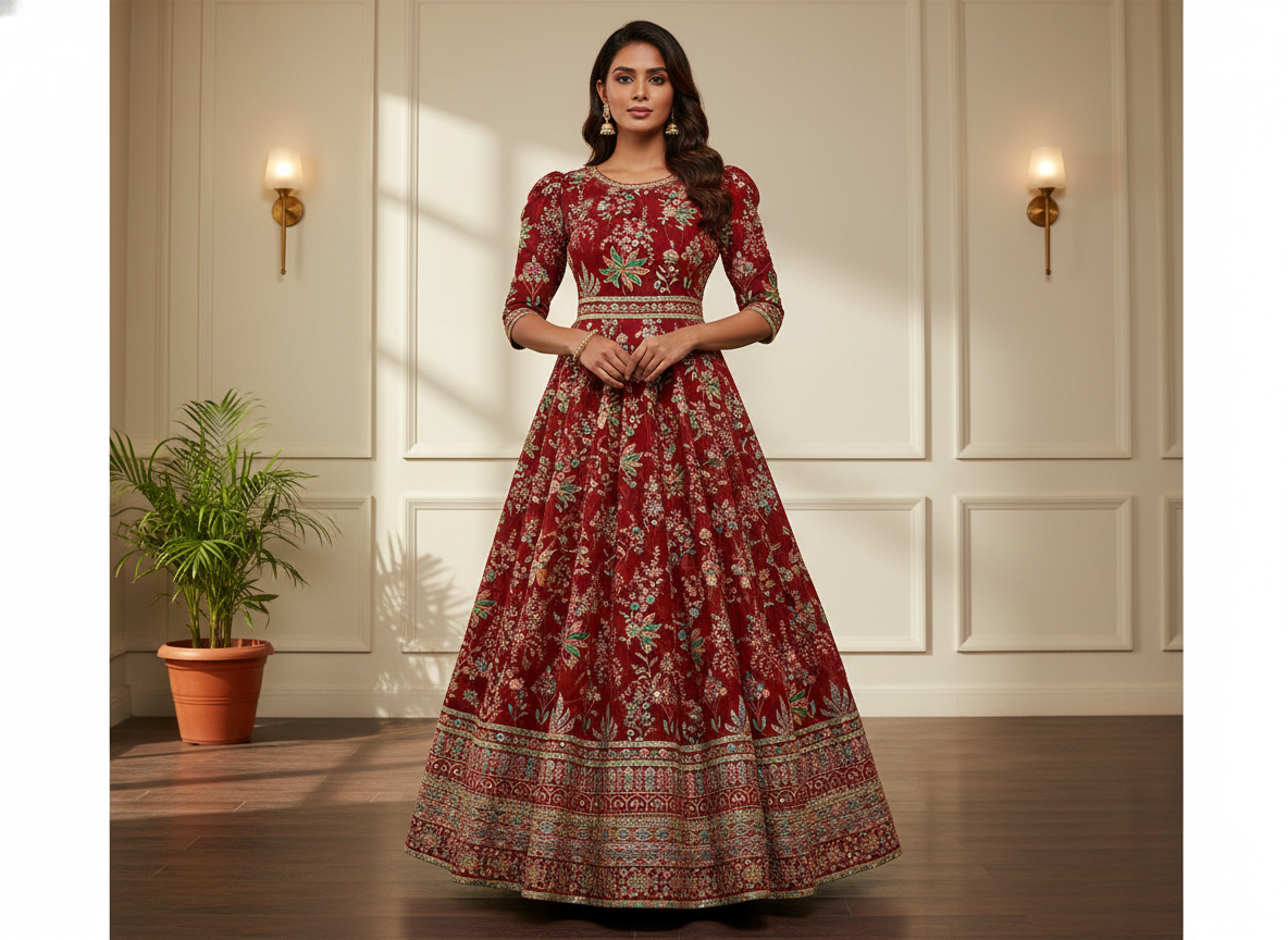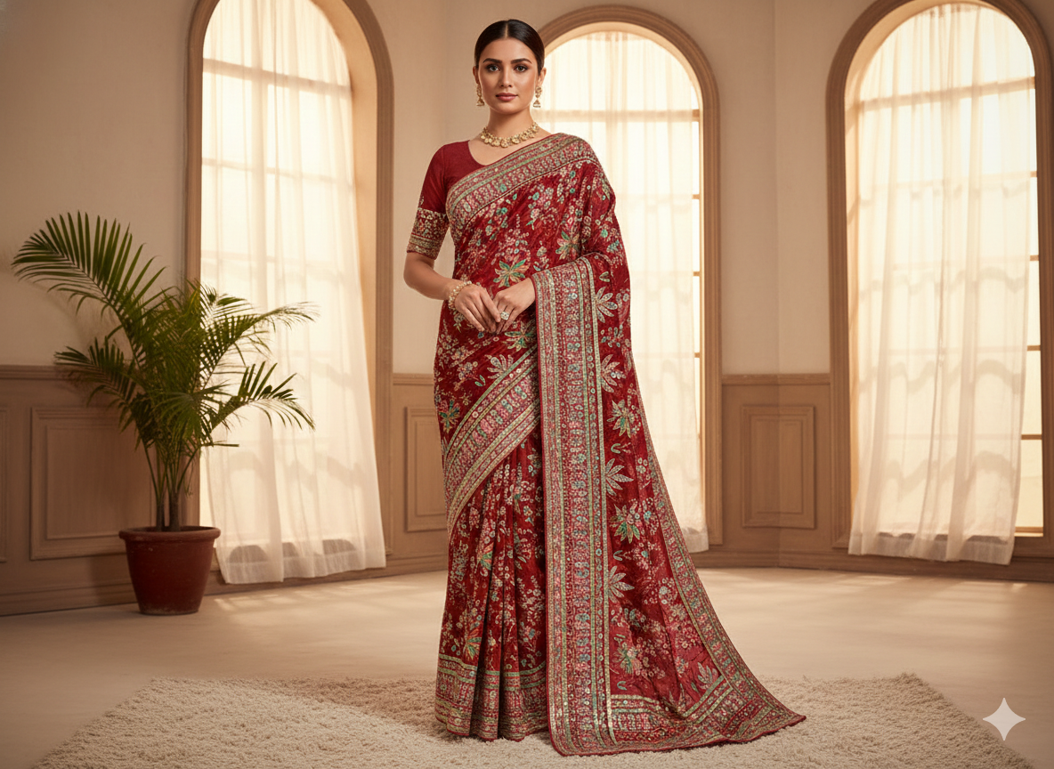 लाल पारंपरिक डिजिटल मुद्रित विस्कोस ऑर्गेना कपड़ा