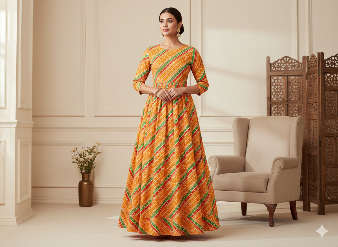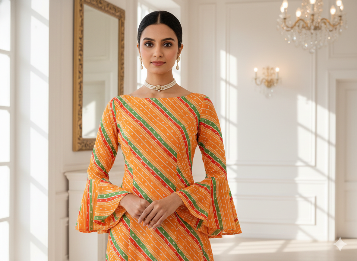 पीली बंधनी पट्टियां मुद्रित चिनॉन फैब्रिक