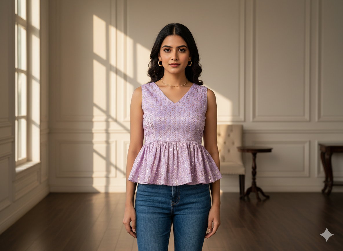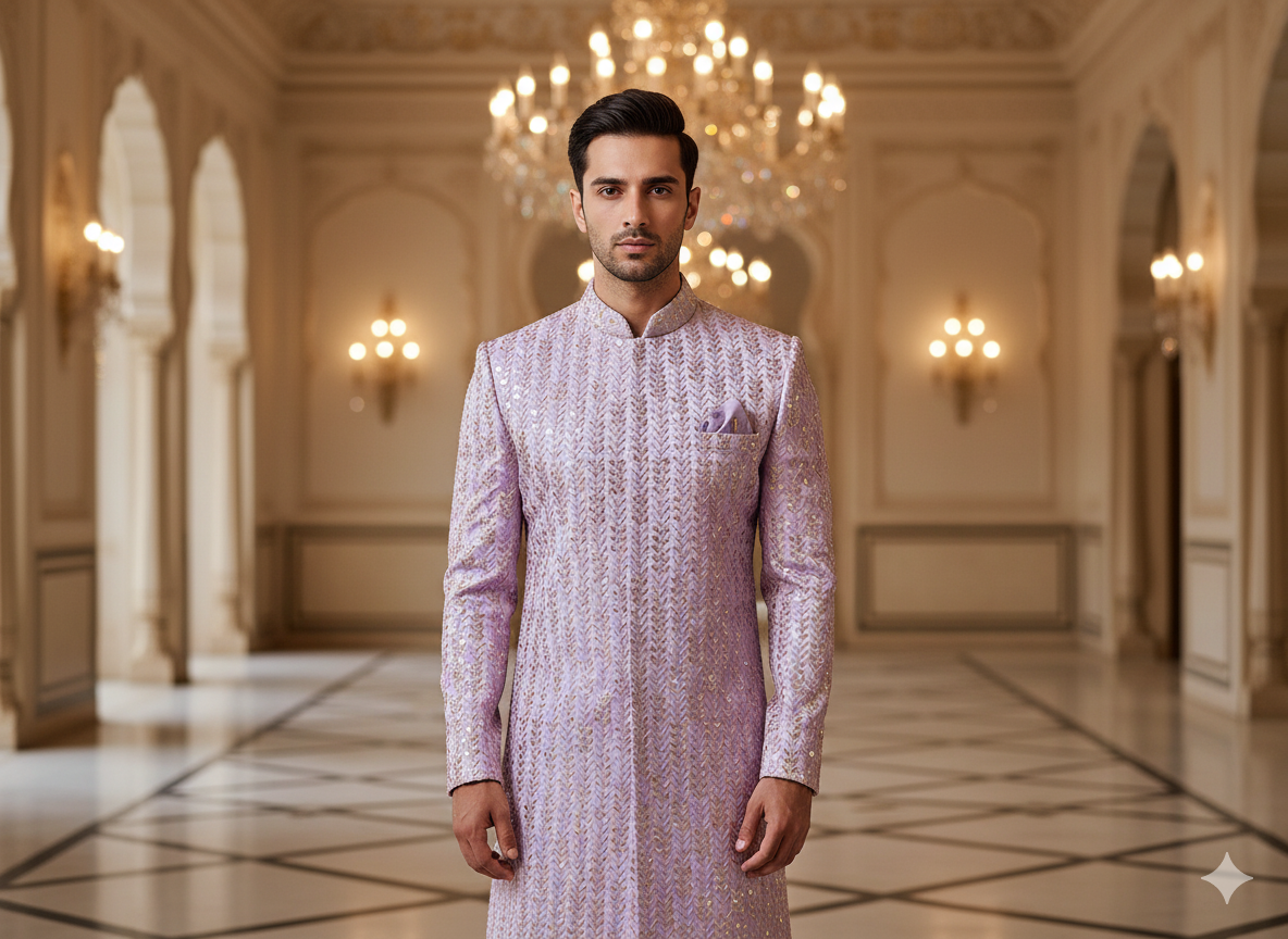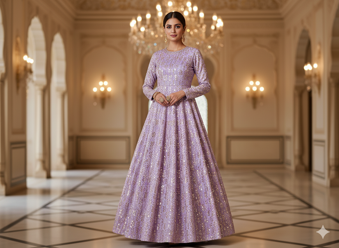 लैवेंडर मेटैलिक सेक्विन कढ़ाई मलाई साटन फैब्रिक