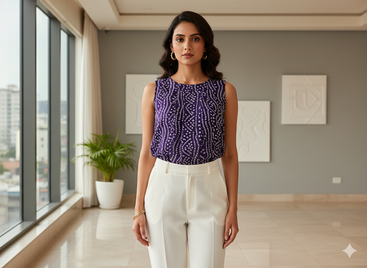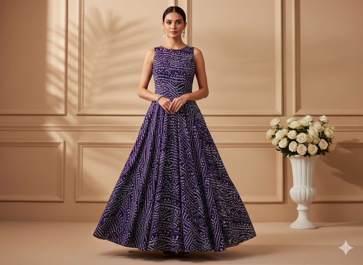 नीला और सफेद बांधनी सार डिजिटल मुद्रित प्रीमियम क्रेप फैब्रिक