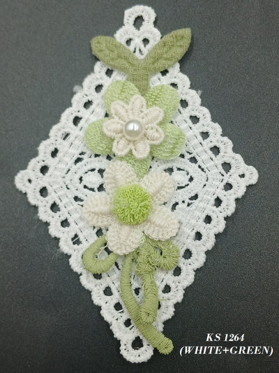This is a handmade crocheted accessory featuring a cluster of white and light green flowers with two pale green leaves at the top. One flower is a mix of white and green, while the other is adorned with a small white pearl at its center. The design is finished with two looping green crocheted ribbons. The entire floral arrangement is attached to a diamond-shaped white crocheted lace backing. This versatile appliqué can be used to embellish various garments, bags, or other textile items.
