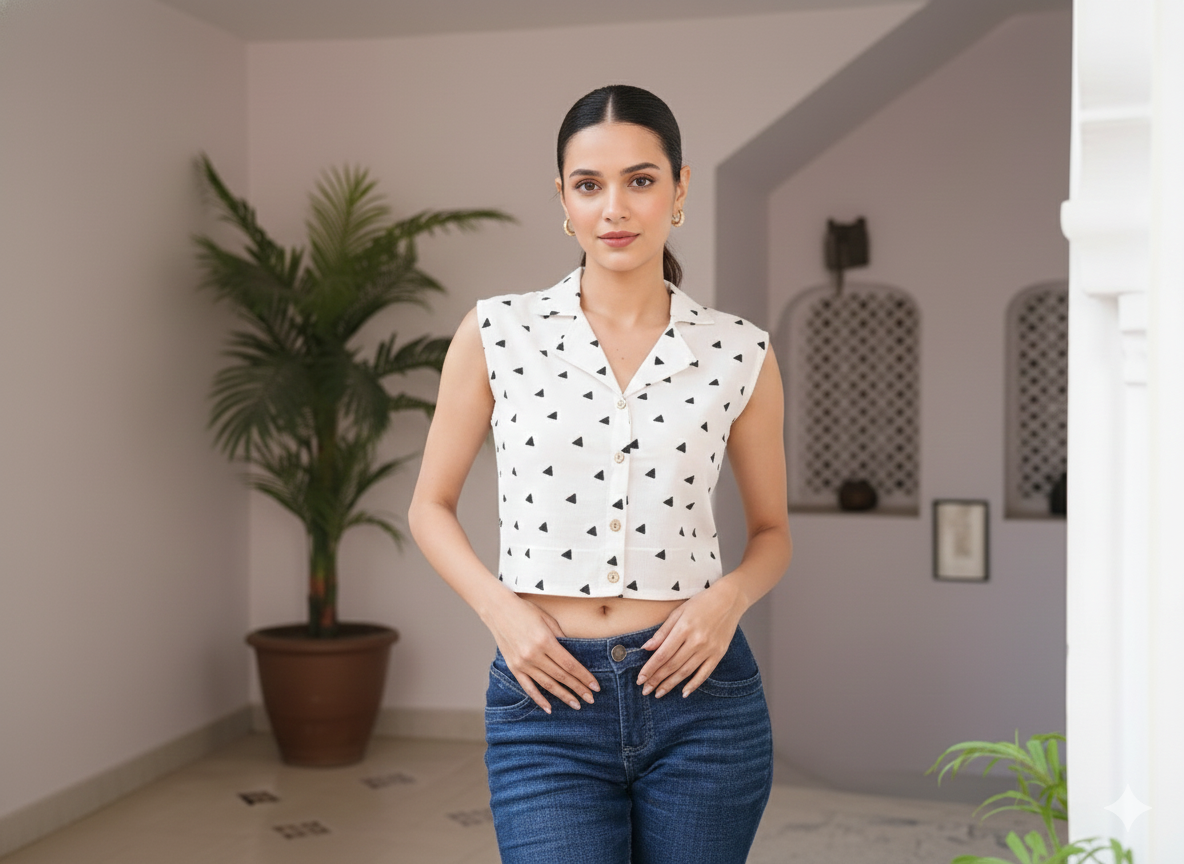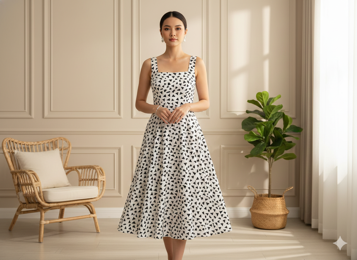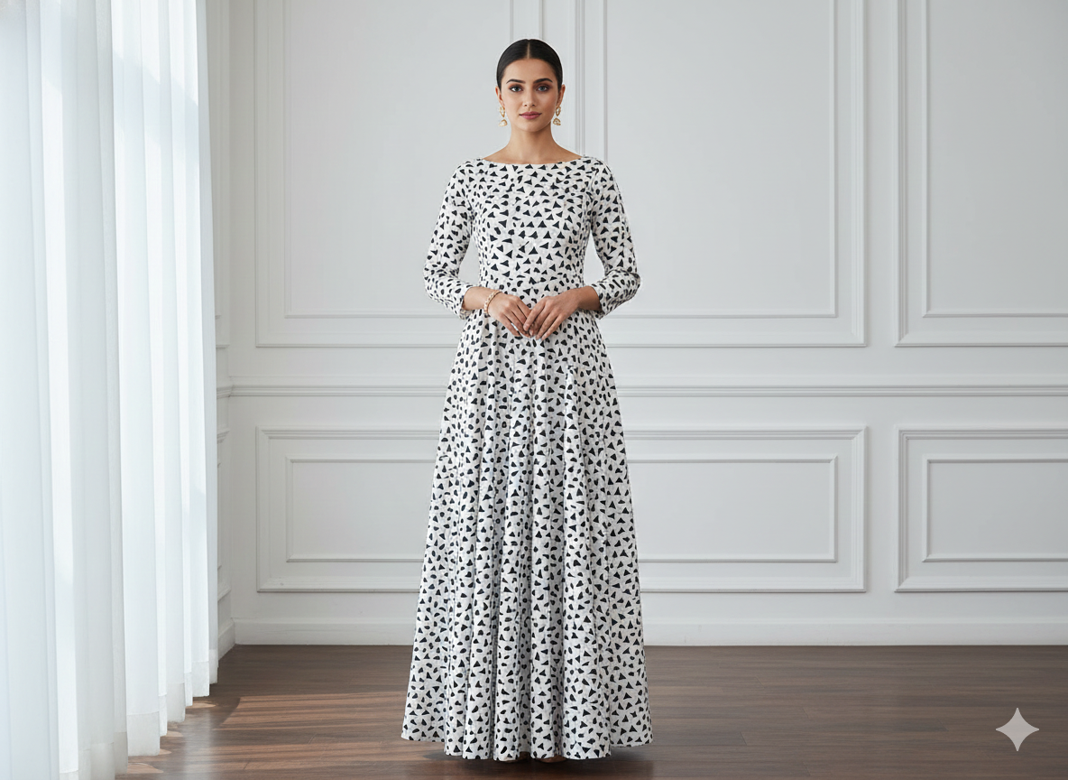 सफ़ेद और काला ज्यामितीय डिजिटल प्रिंटेड प्रीमियम बटर क्रेप फ़ैब्रिक