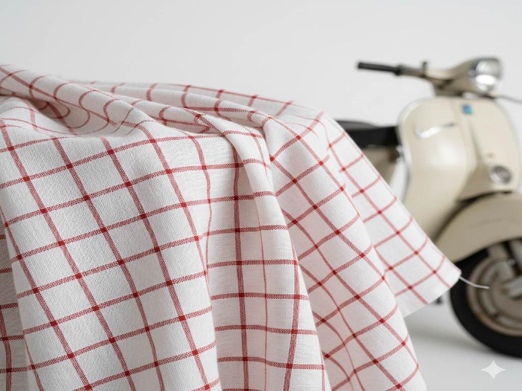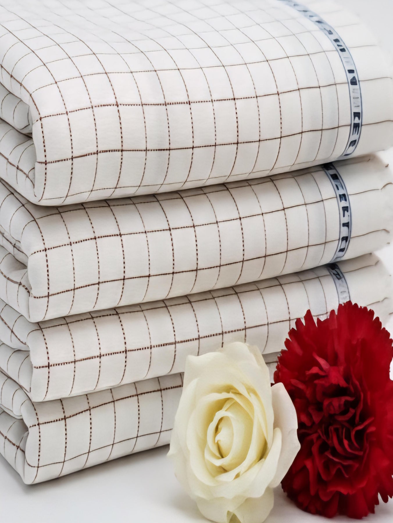 This expertly crafted white cotton linen fabric features a timeless burgundy check pattern, perfect for creating stylish and versatile shirts. Made with 60lea thread for a durable and comfortable fit. Elevate your wardrobe with this classic and versatile fabric.