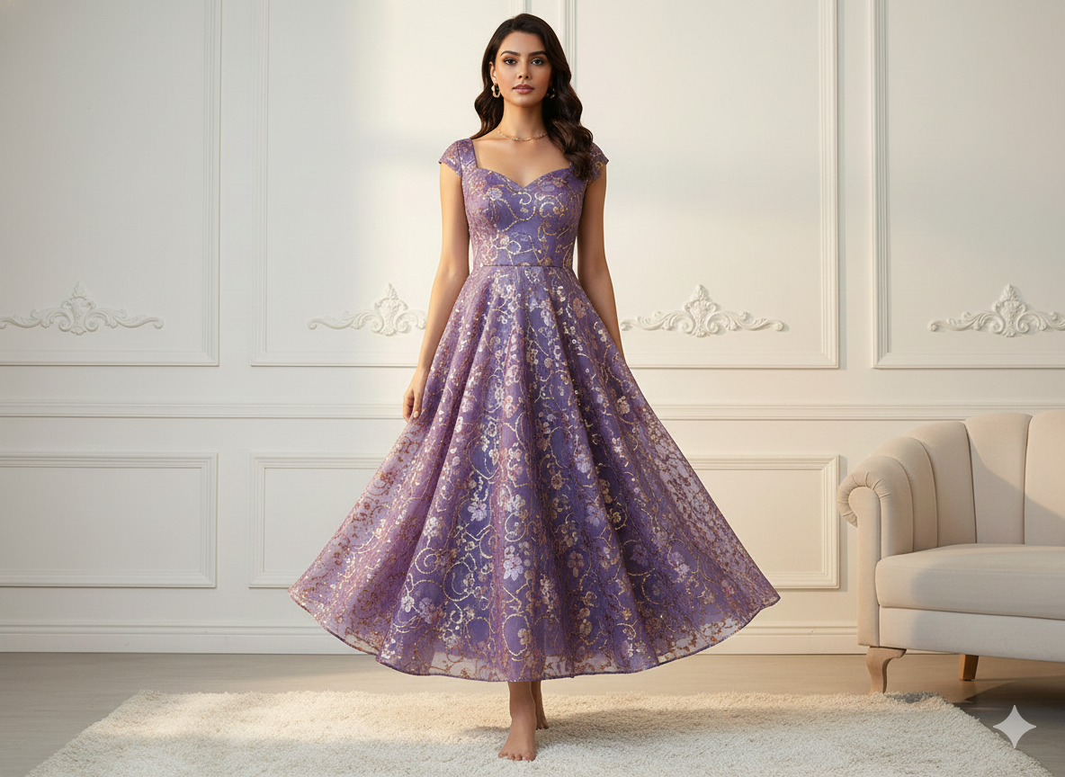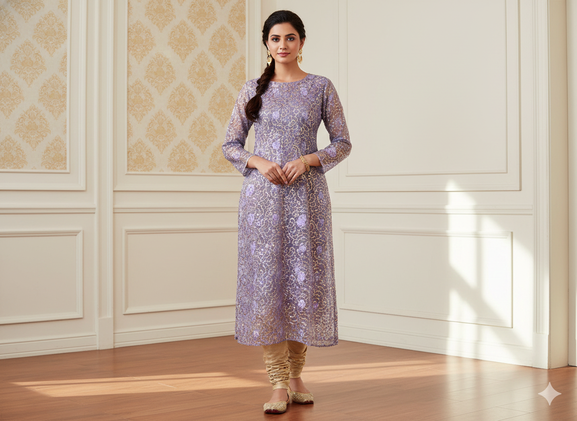 लाइट लैवेंडर एब्स्ट्रैक्ट सेक्विन वर्क ऑर्गेना फैब्रिक