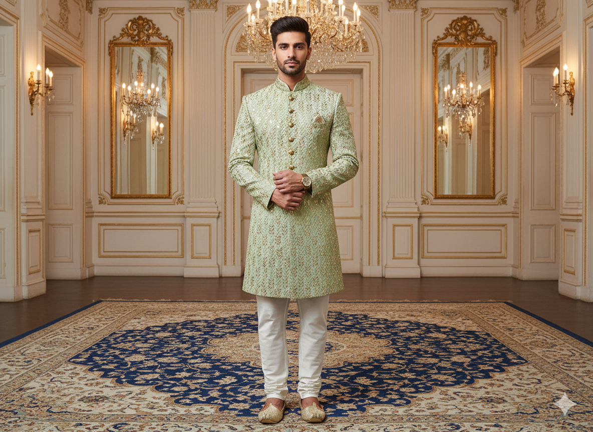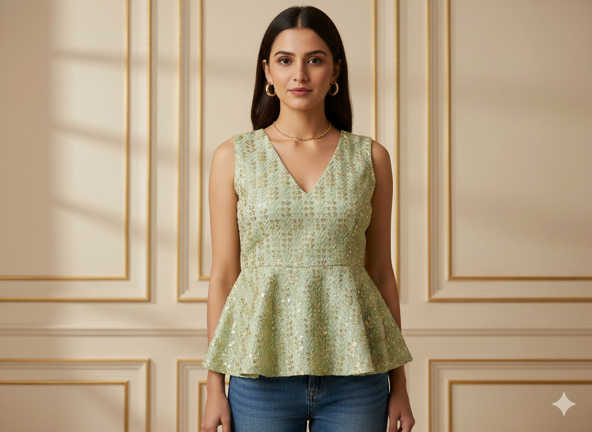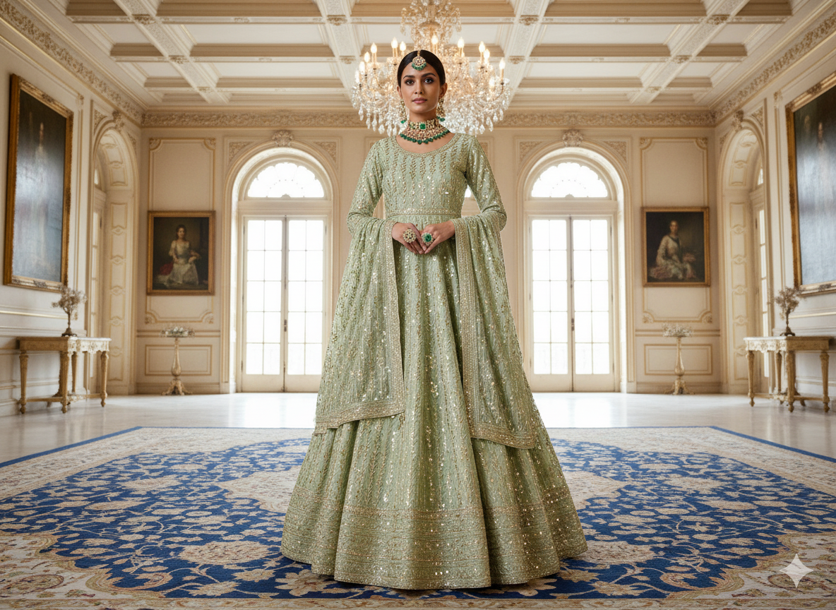 पिस्ता ग्रीन मेटैलिक सेक्विन कढ़ाई मलाई साटन फैब्रिक