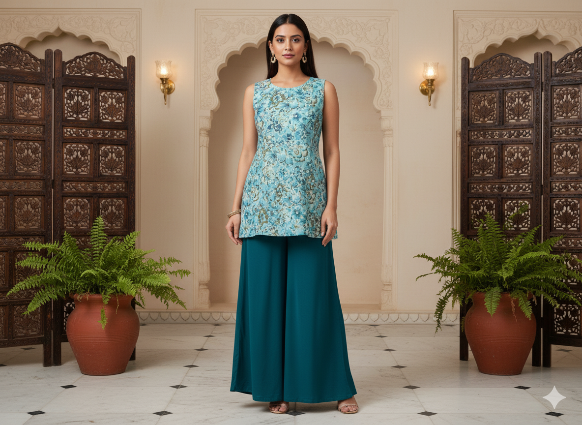 Digitally Printed Butter Crepe Fabric is a soft, lightweight, and flowy synthetic fabric that is digitally printed with various designs. Here's a full breakdown: Fabric Name: Butter Crepe (Digitally Printed) Material: Usually polyester or a polyester blend Texture: Smooth, slightly crinkled, and soft to the touch (hence ""butter"") Weight: Light to medium-weight Stretch: Typically slight to moderate stretch, depending on the blend Finish: Matte or semi-matte, not shiny Prints: High-resolution digital prints (florals, abstracts, ethnic, etc.) Drape: Excellent drape, flows well Durability: Wrinkle-resistant and strong